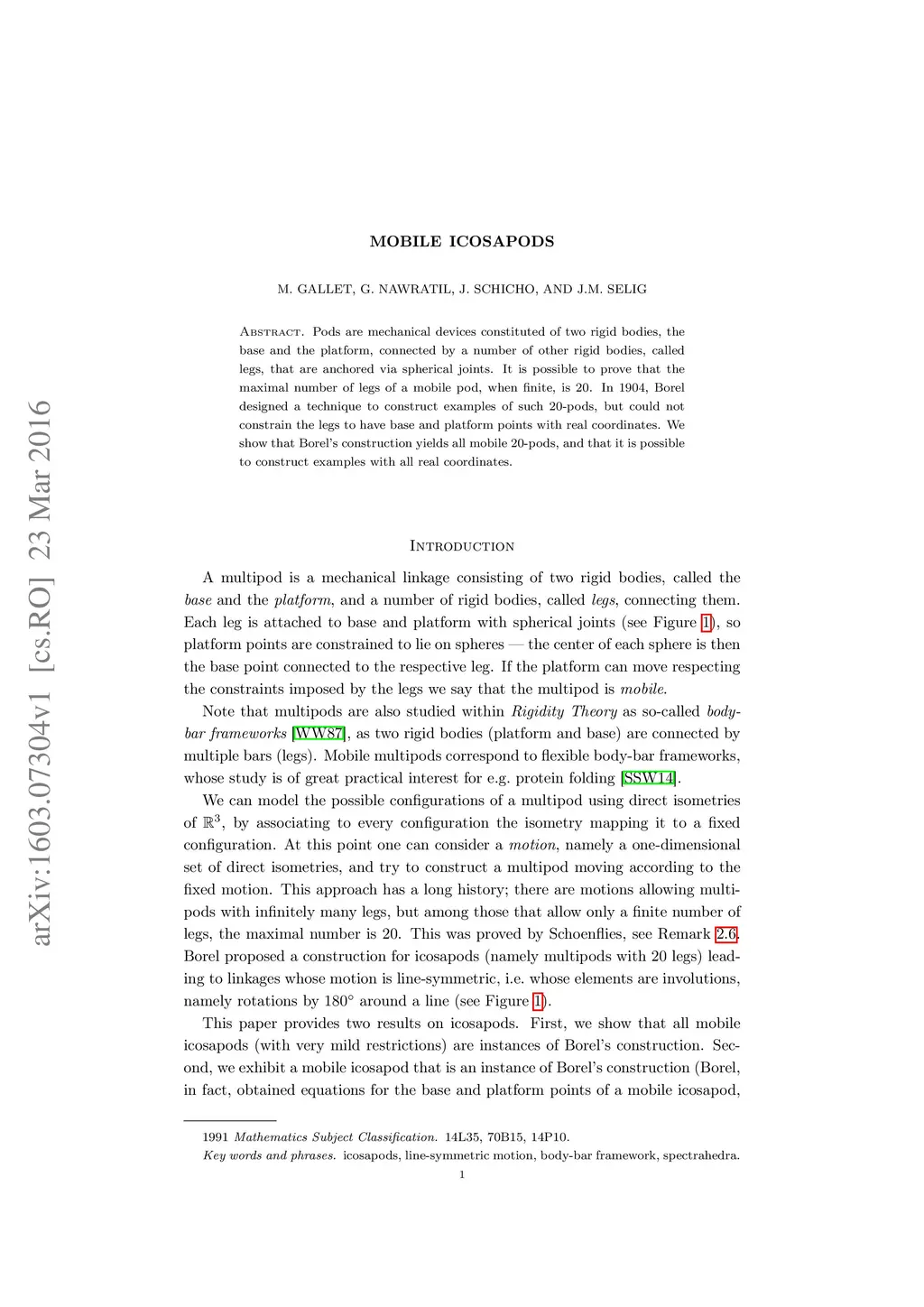 Pods are mechanical devices constituted of two rigid bodies, the base and the platform, connected by a number of other rigid bodies, called legs, that are anchored via spherical joints. It is possible to prove that the maximal number of legs of a mobile pod, when finite, is 20. In 1904, Borel designed a technique to construct examples of such 20-pods, but could not constrain the legs to have base and platform points with real coordinates. We show that Borel's construction yields all mobile 20-pods, and that it is possible to construct examples with all real coordinates.