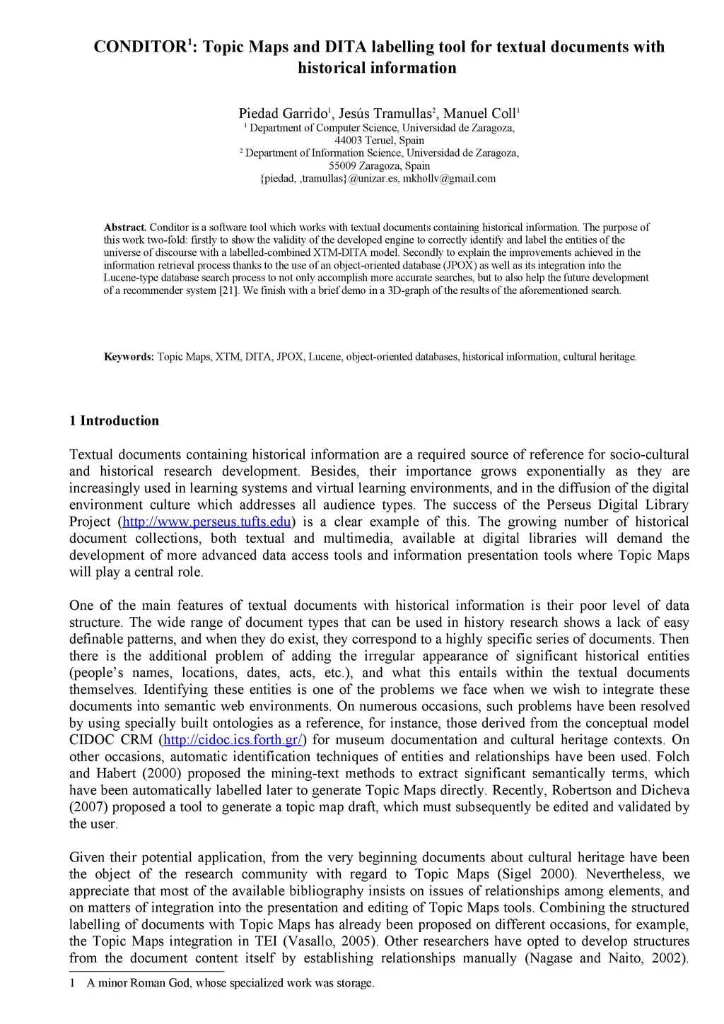 Conditor is a software tool which works with textual documents containing historical information. The purpose of this work two-fold: firstly to show the validity of the developed engine to correctly identify and label the entities of the universe of discourse with a labelled-combined XTM-DITA model. Secondly to explain the improvements achieved in the information retrieval process thanks to the use of a object-oriented database (JPOX) as well as its integration into the Lucene-type database search process to not only accomplish more accurate searches, but to also help the future development of a recommender system. We finish with a brief demo in a 3D-graph of the results of the aforementioned search.