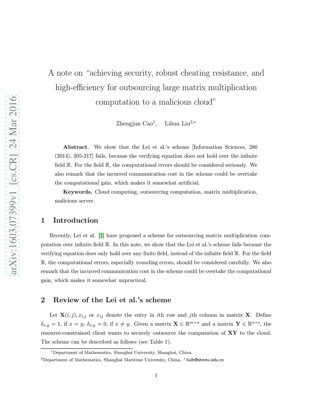 We show that the Lei et al.'s scheme [Information Sciences, 280 (2014), 205-217] fails, because the verifying equation does not hold over the infinite field R. For the field R, the computational errors should be considered seriously. We also remark that the incurred communication cost in the scheme could be overtake the computational gain, which makes it somewhat artificial.