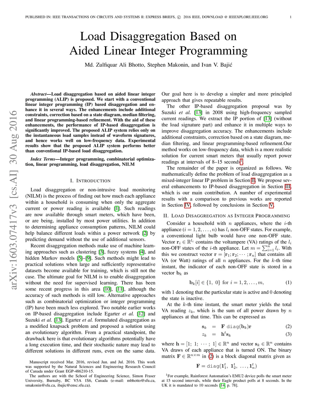 Load disaggregation based on aided linear integer programming (ALIP) is proposed. We start with a conventional linear integer programming (IP) based disaggregation and enhance it in several ways. The enhancements include additional constraints, correction based on a state diagram, median filtering, and linear programming-based refinement. With the aid of these enhancements, the performance of IP-based disaggregation is significantly improved. The proposed ALIP system relies only on the instantaneous load samples instead of waveform signatures, and hence does not crucially depend on high sampling frequency. Experimental results show that the proposed ALIP system performs better than the conventional IP-based load disaggregation system.