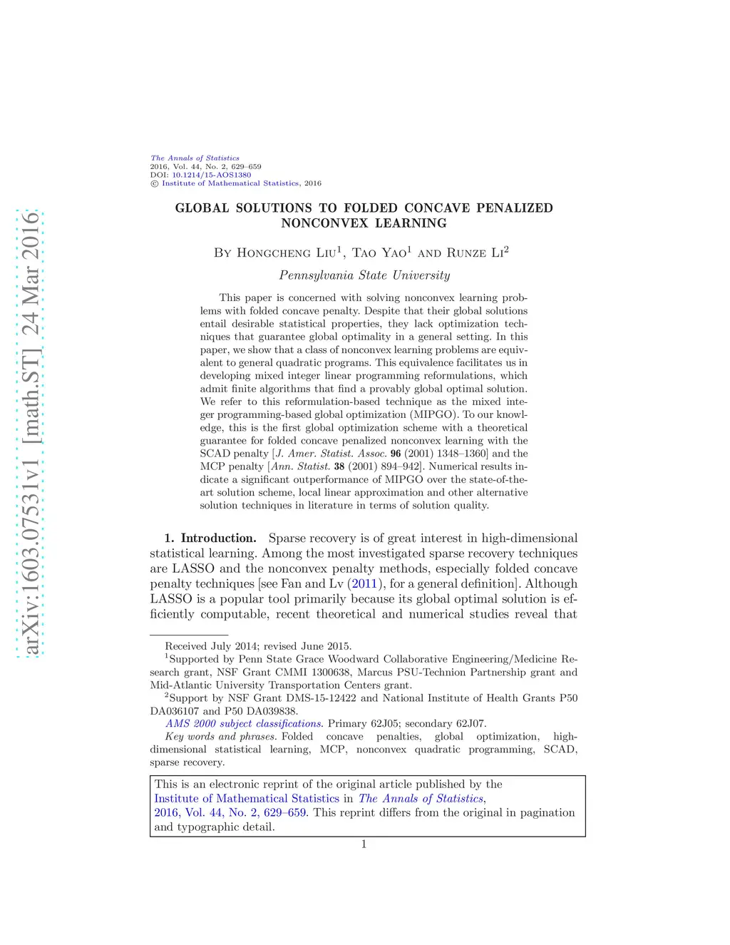 This paper is concerned with solving nonconvex learning problems with folded concave penalty. Despite that their global solutions entail desirable statistical properties, they lack optimization techniques that guarantee global optimality in a general setting. In this paper, we show that a class of nonconvex learning problems are equivalent to general quadratic programs. This equivalence facilitates us in developing mixed integer linear programming reformulations, which admit finite algorithms that find a provably global optimal solution. We refer to this reformulation-based technique as the mixed integer programming-based global optimization (MIPGO). To our knowledge, this is the first global optimization scheme with a theoretical guarantee for folded concave penalized nonconvex learning with the SCAD penalty [J. Amer. Statist. Assoc. 96 (2001) 1348-1360] and the MCP penalty [Ann. Statist. 38 (2001) 894-942]. Numerical results indicate a significant outperformance of MIPGO over the state-of-the-art solution scheme, local linear approximation and other alternative solution techniques in literature in terms of solution quality.