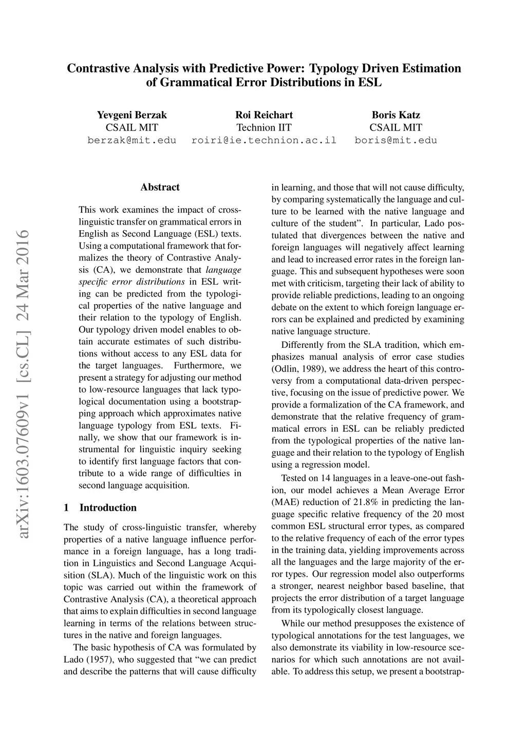 This work examines the impact of cross-linguistic transfer on grammatical errors in English as Second Language (ESL) texts. Using a computational framework that formalizes the theory of Contrastive Analysis (CA), we demonstrate that language specific error distributions in ESL writing can be predicted from the typological properties of the native language and their relation to the typology of English. Our typology driven model enables to obtain accurate estimates of such distributions without access to any ESL data for the target languages. Furthermore, we present a strategy for adjusting our method to low-resource languages that lack typological documentation using a bootstrapping approach which approximates native language typology from ESL texts. Finally, we show that our framework is instrumental for linguistic inquiry seeking to identify first language factors that contribute to a wide range of difficulties in second language acquisition.