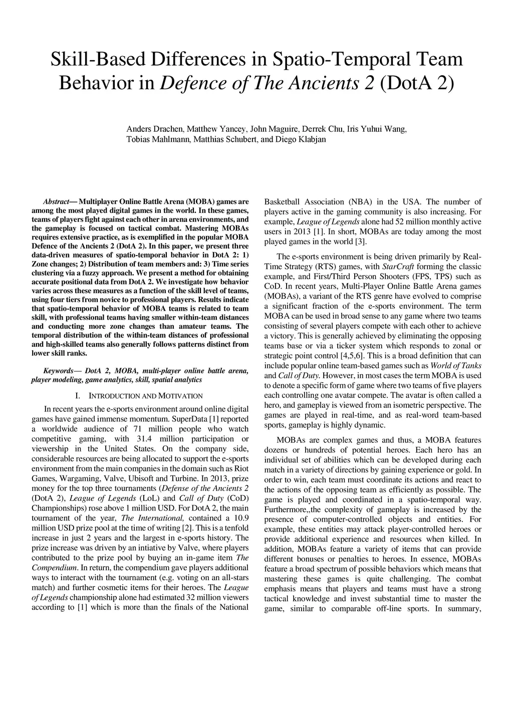 Multiplayer Online Battle Arena (MOBA) games are among the most played digital games in the world. In these games, teams of players fight against each other in arena environments, and the gameplay is focused on tactical combat. Mastering MOBAs requires extensive practice, as is exemplified in the popular MOBA Defence of the Ancients 2 (DotA 2). In this paper, we present three data-driven measures of spatio-temporal behavior in DotA 2: 1) Zone changes; 2) Distribution of team members and: 3) Time series clustering via a fuzzy approach. We present a method for obtaining accurate positional data from DotA 2. We investigate how behavior varies across these measures as a function of the skill level of teams, using four tiers from novice to professional players. Results indicate that spatio-temporal behavior of MOBA teams is related to team skill, with professional teams having smaller within-team distances and conducting more zone changes than amateur teams. The temporal distribution of the within-team distances of professional and high-skilled teams also generally follows patterns distinct from lower skill ranks.