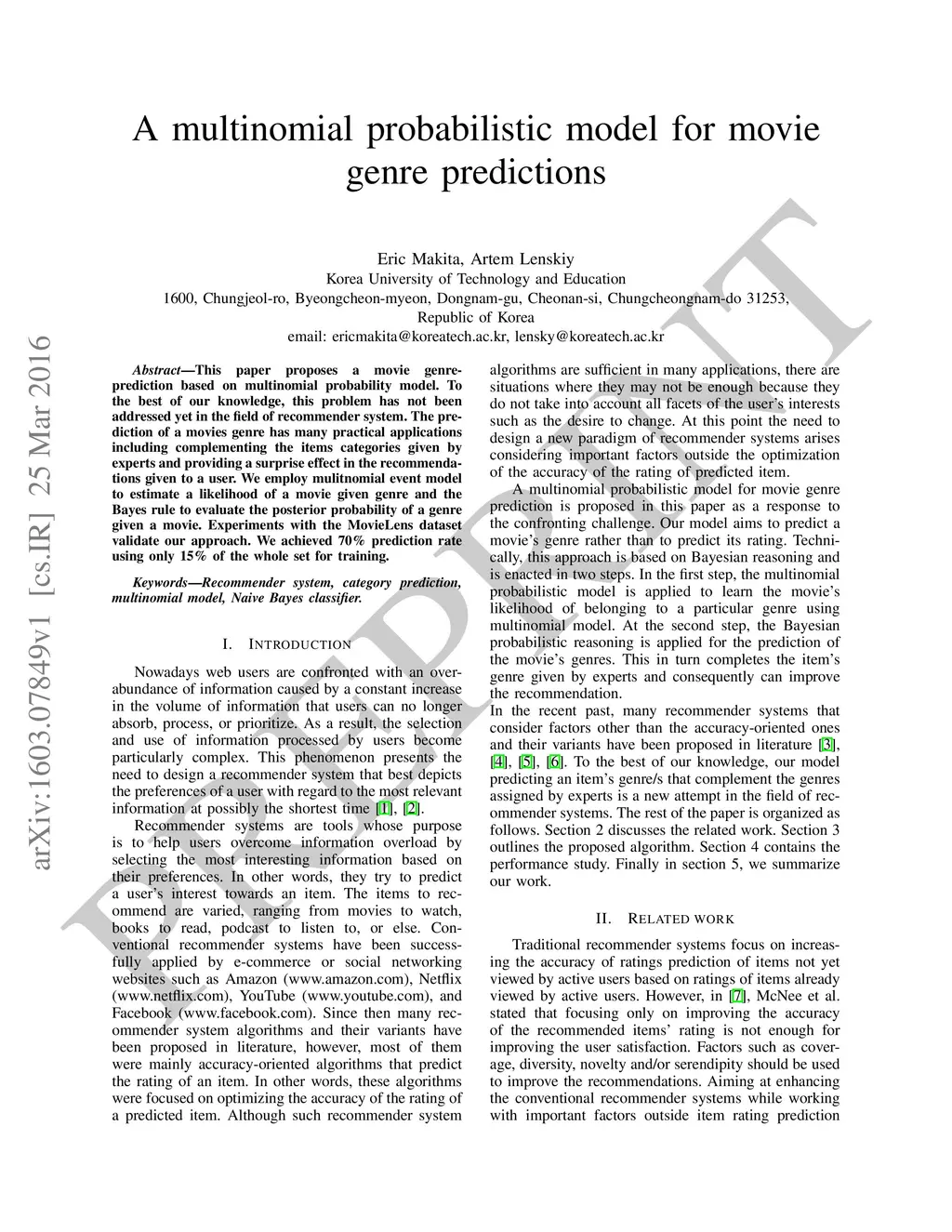 A multinomial probabilistic model for movie genre predictions