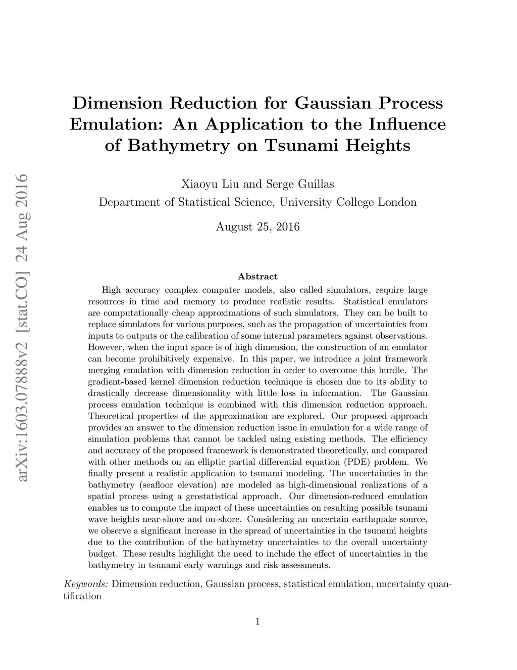 High accuracy complex computer models, or simulators, require large resources in time and memory to produce realistic results. Statistical emulators are computationally cheap approximations of such simulators. They can be built to replace simulators for various purposes, such as the propagation of uncertainties from inputs to outputs or the calibration of some internal parameters against observations. However, when the input space is of high dimension, the construction of an emulator can become prohibitively expensive. In this paper, we introduce a joint framework merging emulation with dimension reduction in order to overcome this hurdle. The gradient-based kernel dimension reduction technique is chosen due to its ability to drastically decrease dimensionality with little loss in information. The Gaussian process emulation technique is combined with this dimension reduction approach. Our proposed approach provides an answer to the dimension reduction issue in emulation for a wide range of simulation problems that cannot be tackled using existing methods. The efficiency and accuracy of the proposed framework is demonstrated theoretically, and compared with other methods on an elliptic partial differential equation (PDE) problem. We finally present a realistic application to tsunami modeling. The uncertainties in the bathymetry (seafloor elevation) are modeled as high-dimensional realizations of a spatial process using a geostatistical approach. Our dimension-reduced emulation enables us to compute the impact of these uncertainties on resulting possible tsunami wave heights near-shore and on-shore. We observe a significant increase in the spread of uncertainties in the tsunami heights due to the contribution of the bathymetry uncertainties. These results highlight the need to include the effect of uncertainties in the bathymetry in tsunami early warnings and risk assessments.