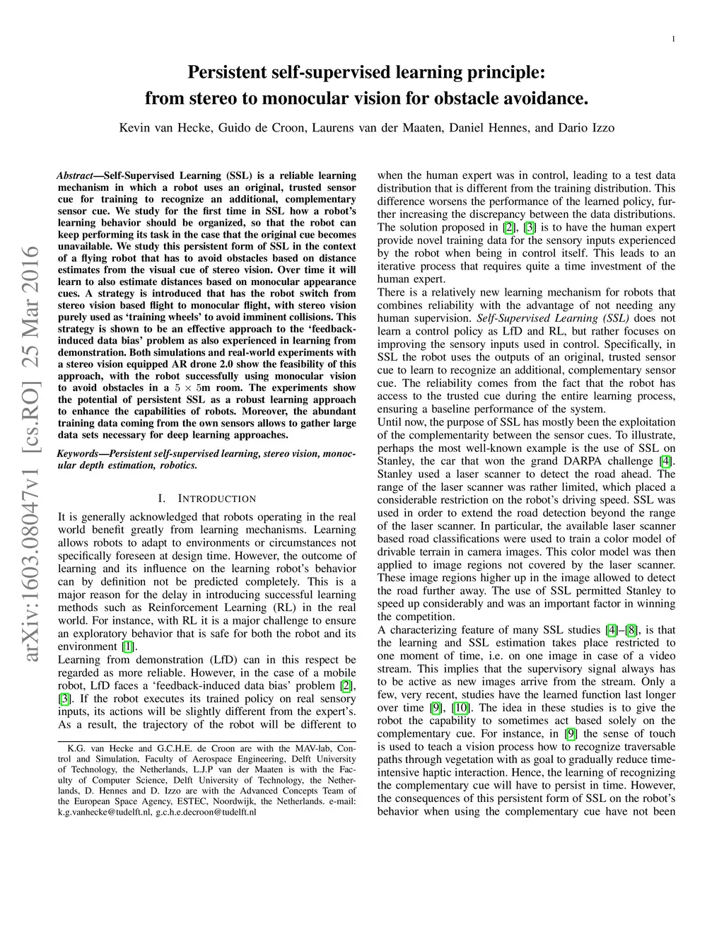 Self-Supervised Learning (SSL) is a reliable learning mechanism in which a robot uses an original, trusted sensor cue for training to recognize an additional, complementary sensor cue. We study for the first time in SSL how a robot's learning behavior should be organized, so that the robot can keep performing its task in the case that the original cue becomes unavailable. We study this persistent form of SSL in the context of a flying robot that has to avoid obstacles based on distance estimates from the visual cue of stereo vision. Over time it will learn to also estimate distances based on monocular appearance cues. A strategy is introduced that has the robot switch from stereo vision based flight to monocular flight, with stereo vision purely used as 'training wheels' to avoid imminent collisions. This strategy is shown to be an effective approach to the 'feedback-induced data bias' problem as also experienced in learning from demonstration. Both simulations and real-world experiments with a stereo vision equipped AR drone 2.0 show the feasibility of this approach, with the robot successfully using monocular vision to avoid obstacles in a 5 x 5 room. The experiments show the potential of persistent SSL as a robust learning approach to enhance the capabilities of robots. Moreover, the abundant training data coming from the own sensors allows to gather large data sets necessary for deep learning approaches.