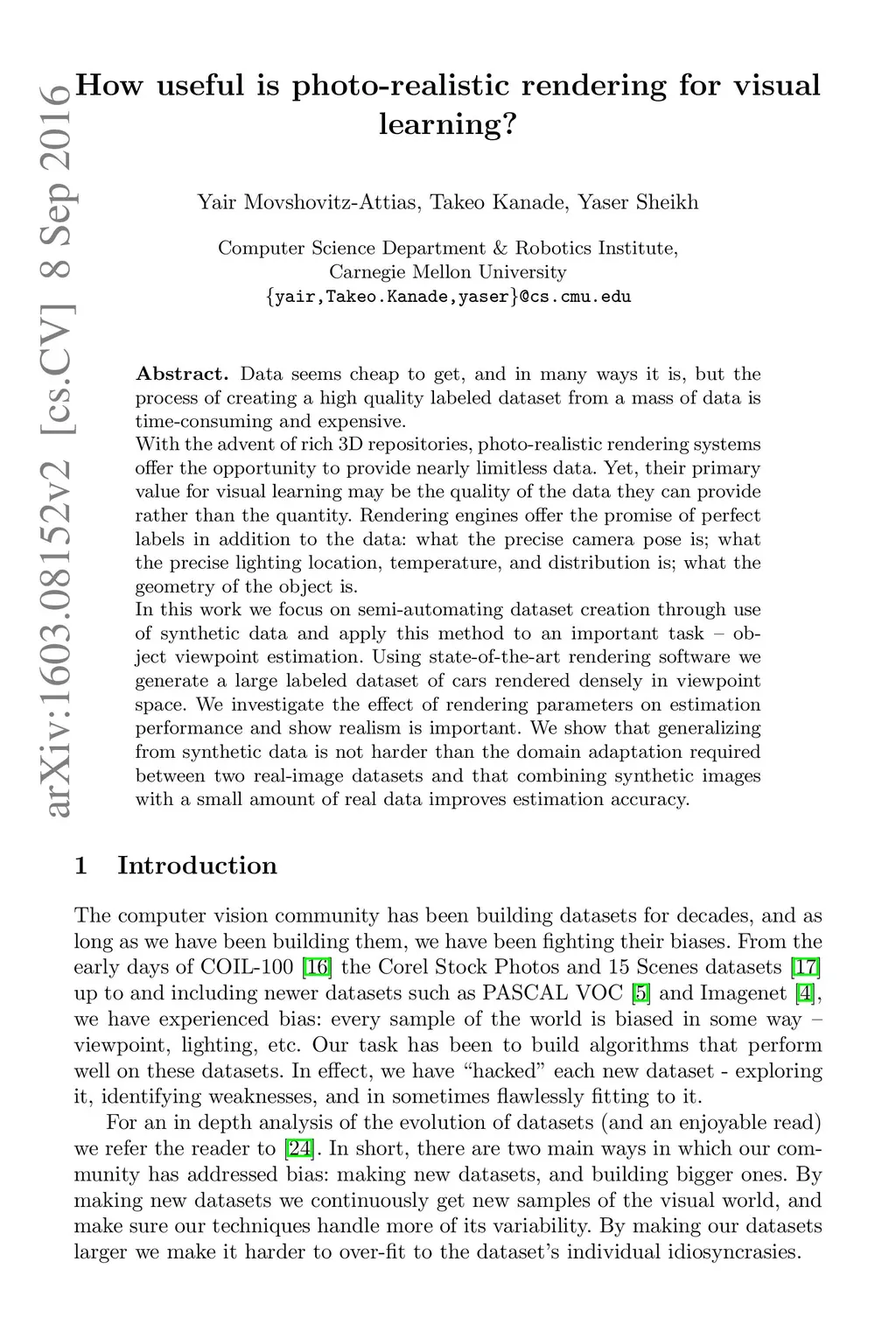 Data seems cheap to get, and in many ways it is, but the process of creating a high quality labeled dataset from a mass of data is time-consuming and expensive. With the advent of rich 3D repositories, photo-realistic rendering systems offer the opportunity to provide nearly limitless data. Yet, their primary value for visual learning may be the quality of the data they can provide rather than the quantity. Rendering engines offer the promise of perfect labels in addition to the data: what the precise camera pose is; what the precise lighting location, temperature, and distribution is; what the geometry of the object is. In this work we focus on semi-automating dataset creation through use of synthetic data and apply this method to an important task -- object viewpoint estimation. Using state-of-the-art rendering software we generate a large labeled dataset of cars rendered densely in viewpoint space. We investigate the effect of rendering parameters on estimation performance and show realism is important. We show that generalizing from synthetic data is not harder than the domain adaptation required between two real-image datasets and that combining synthetic images with a small amount of real data improves estimation accuracy.