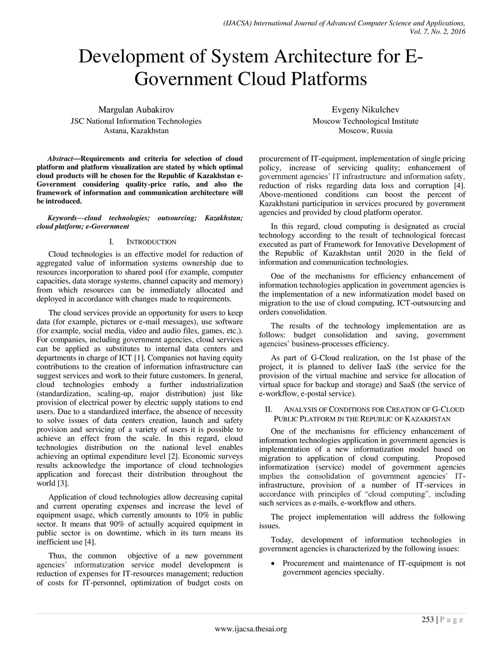 Requirements and criteria for selection of cloud platform and platform visualization are stated by which optimal cloud products will be chosen for the Republic of Kazakhstan e-Government considering quality-price ratio, and also the framework of information and communication architecture will be introduced.