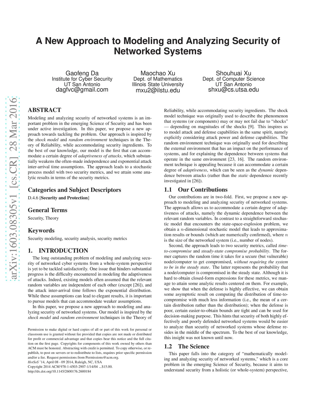 Modeling and analyzing security of networked systems is an important problem in the emerging Science of Security and has been under active investigation. In this paper, we propose a new approach towards tackling the problem. Our approach is inspired by the {\em shock model} and {\em random environment} techniques in the Theory of Reliability, while accommodating security ingredients. To the best of our knowledge, our model is the first that can accommodate a certain degree of {\em adaptiveness of attacks}, which substantially weakens the often-made independence and exponential attack inter-arrival time assumptions. The approach leads to a stochastic process model with two security metrics, and we attain some analytic results in terms of the security metrics.