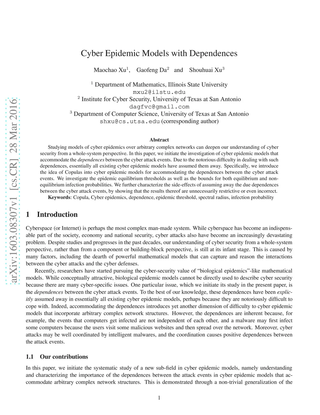 Studying models of cyber epidemics over arbitrary complex networks can deepen our understanding of cyber security from a whole-system perspective. In this paper, we initiate the investigation of cyber epidemic models that accommodate the {\em dependences} between the cyber attack events. Due to the notorious difficulty in dealing with such dependences, essentially all existing cyber epidemic models have assumed them away. Specifically, we introduce the idea of Copulas into cyber epidemic models for accommodating the dependences between the cyber attack events. We investigate the epidemic equilibrium thresholds as well as the bounds for both equilibrium and non-equilibrium infection probabilities. We further characterize the side-effects of assuming away the due dependences between the cyber attack events, by showing that the results thereof are unnecessarily restrictive or even incorrect.