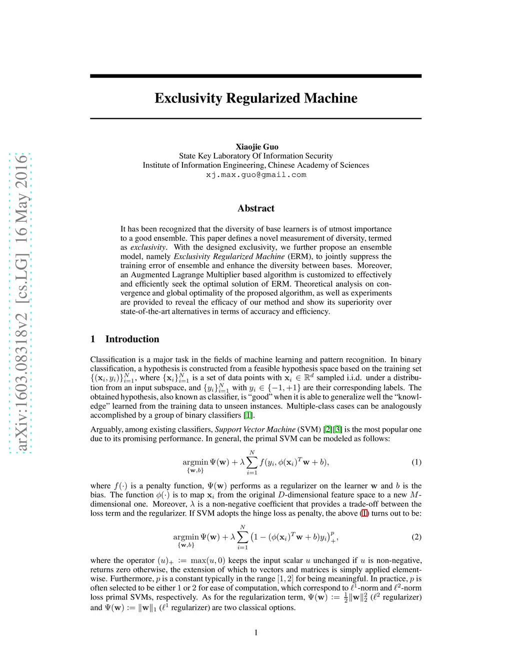 It has been recognized that the diversity of base learners is of utmost importance to a good ensemble. This paper defines a novel measurement of diversity, termed as exclusivity. With the designed exclusivity, we further propose an ensemble model, namely Exclusivity Regularized Machine (ERM), to jointly suppress the training error of ensemble and enhance the diversity between bases. Moreover, an Augmented Lagrange Multiplier based algorithm is customized to effectively and efficiently seek the optimal solution of ERM. Theoretical analysis on convergence and global optimality of the proposed algorithm, as well as experiments are provided to reveal the efficacy of our method and show its superiority over state-of-the-art alternatives in terms of accuracy and efficiency.