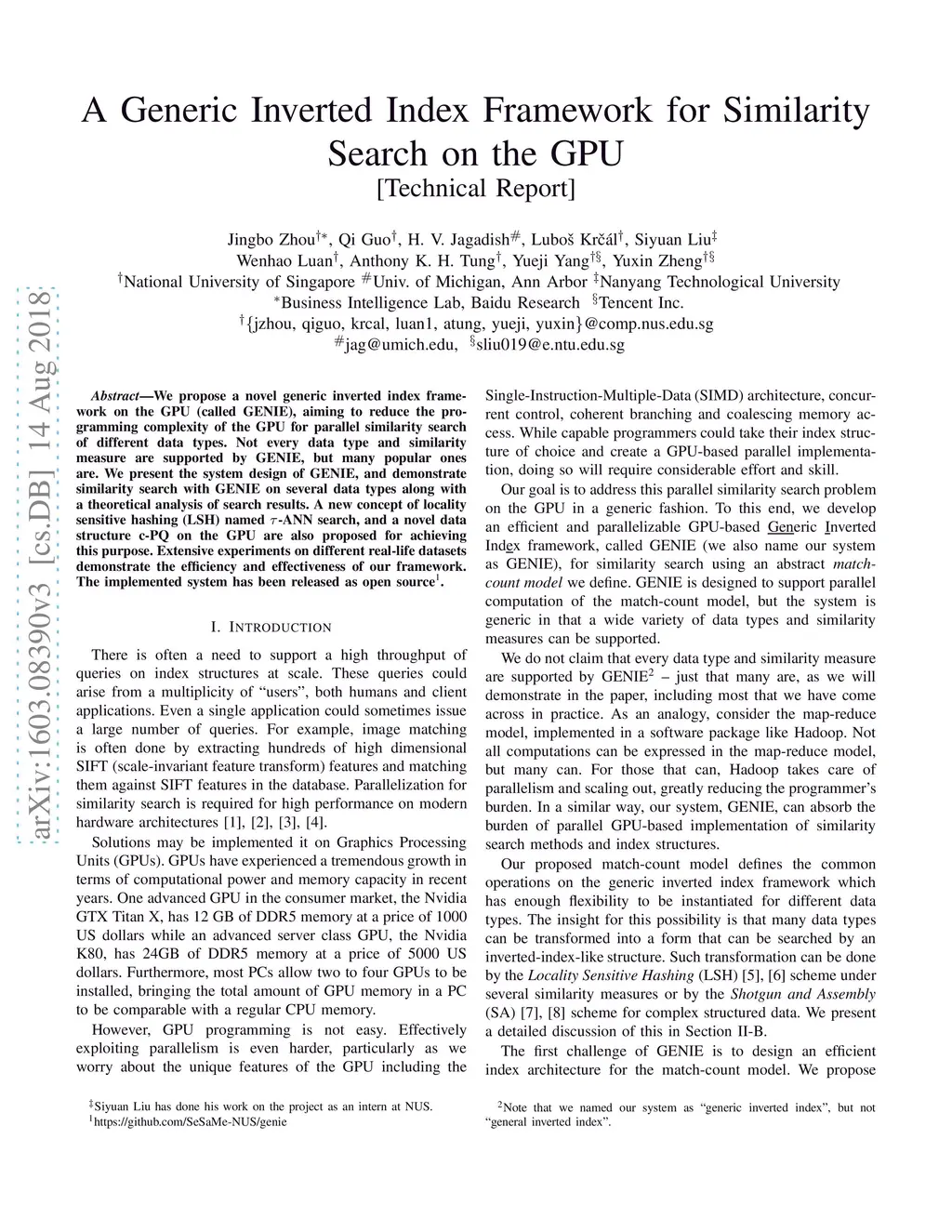 We propose a novel generic inverted index framework on the GPU (called GENIE), aiming to reduce the programming complexity of the GPU for parallel similarity search of different data types. Not every data type and similarity measure are supported by GENIE, but many popular ones are. We present the system design of GENIE, and demonstrate similarity search with GENIE on several data types along with a theoretical analysis of search results. A new concept of locality sensitive hashing (LSH) named -ANN search, and a novel data structure c-PQ on the GPU are also proposed for achieving this purpose. Extensive experiments on different real-life datasets demonstrate the efficiency and effectiveness of our framework. The implemented system has been released as open source.