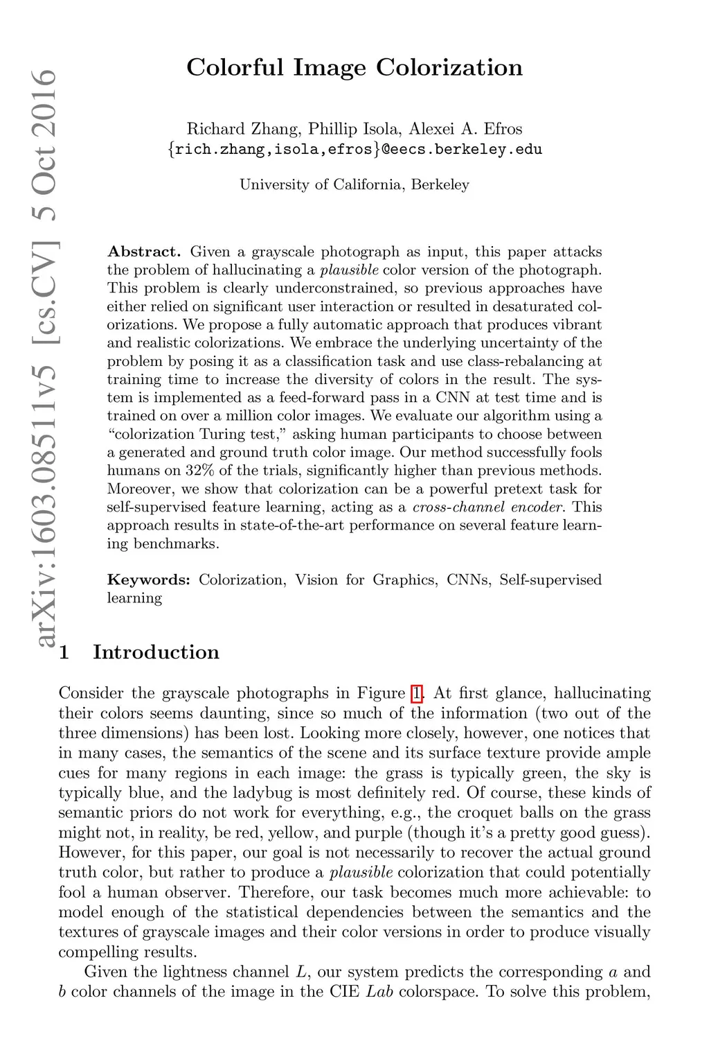 Given a grayscale photograph as input, this paper attacks the problem of hallucinating a plausible color version of the photograph. This problem is clearly underconstrained, so previous approaches have either relied on significant user interaction or resulted in desaturated colorizations. We propose a fully automatic approach that produces vibrant and realistic colorizations. We embrace the underlying uncertainty of the problem by posing it as a classification task and use class-rebalancing at training time to increase the diversity of colors in the result. The system is implemented as a feed-forward pass in a CNN at test time and is trained on over a million color images. We evaluate our algorithm using a "colorization Turing test," asking human participants to choose between a generated and ground truth color image. Our method successfully fools humans on 32% of the trials, significantly higher than previous methods. Moreover, we show that colorization can be a powerful pretext task for self-supervised feature learning, acting as a cross-channel encoder. This approach results in state-of-the-art performance on several feature learning benchmarks.