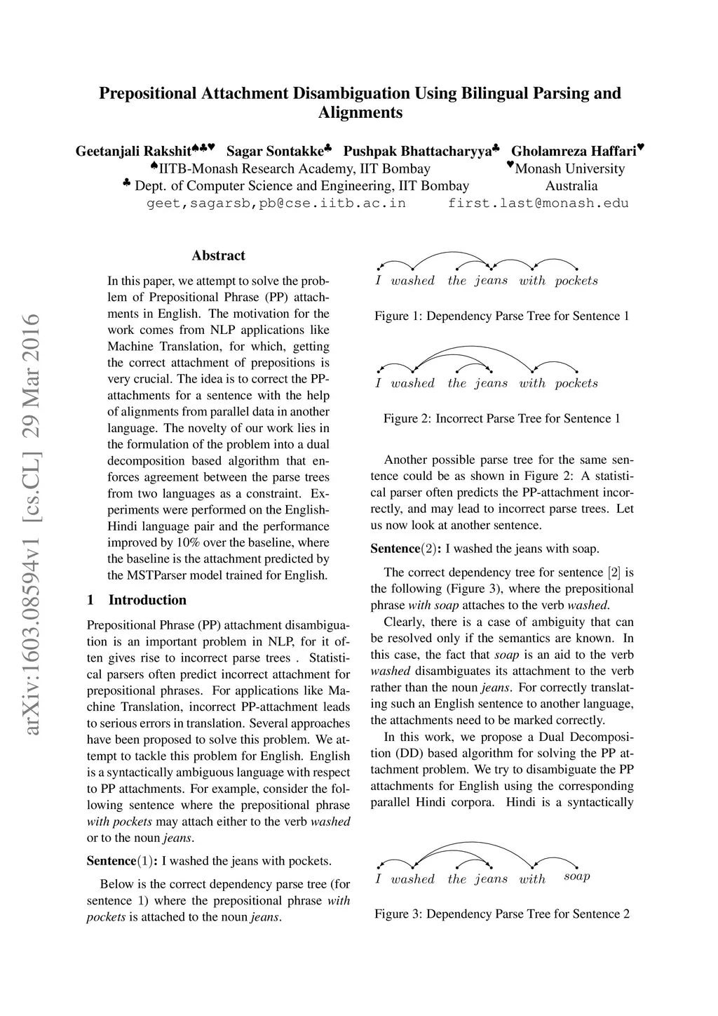 In this paper, we attempt to solve the problem of Prepositional Phrase (PP) attachments in English. The motivation for the work comes from NLP applications like Machine Translation, for which, getting the correct attachment of prepositions is very crucial. The idea is to correct the PP-attachments for a sentence with the help of alignments from parallel data in another language. The novelty of our work lies in the formulation of the problem into a dual decomposition based algorithm that enforces agreement between the parse trees from two languages as a constraint. Experiments were performed on the English-Hindi language pair and the performance improved by 10% over the baseline, where the baseline is the attachment predicted by the MSTParser model trained for English.