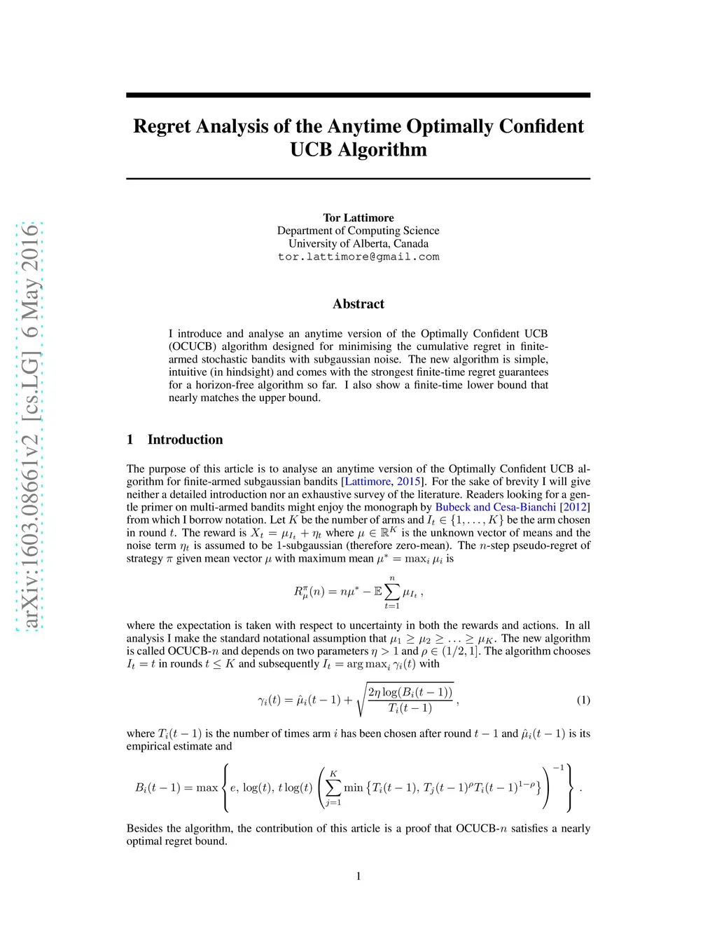 I introduce and analyse an anytime version of the Optimally Confident UCB (OCUCB) algorithm designed for minimising the cumulative regret in finite-armed stochastic bandits with subgaussian noise. The new algorithm is simple, intuitive (in hindsight) and comes with the strongest finite-time regret guarantees for a horizon-free algorithm so far. I also show a finite-time lower bound that nearly matches the upper bound.