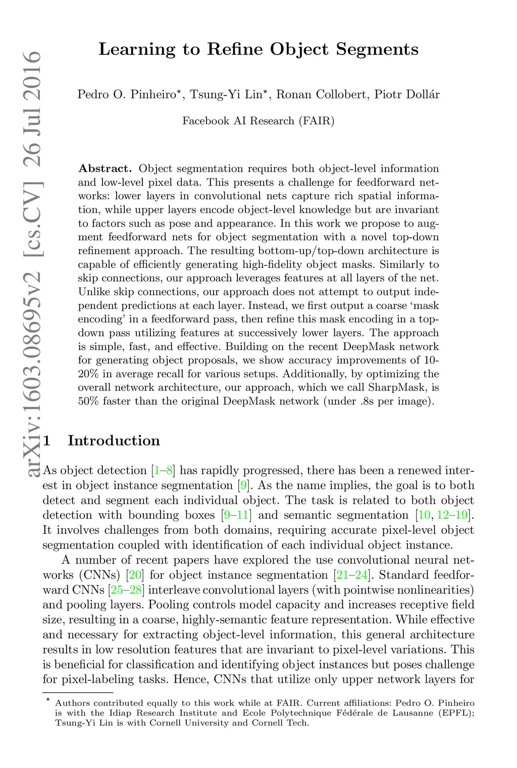 Object segmentation requires both object-level information and low-level pixel data. This presents a challenge for feedforward networks: lower layers in convolutional nets capture rich spatial information, while upper layers encode object-level knowledge but are invariant to factors such as pose and appearance. In this work we propose to augment feedforward nets for object segmentation with a novel top-down refinement approach. The resulting bottom-up/top-down architecture is capable of efficiently generating high-fidelity object masks. Similarly to skip connections, our approach leverages features at all layers of the net. Unlike skip connections, our approach does not attempt to output independent predictions at each layer. Instead, we first output a coarse `mask encoding' in a feedforward pass, then refine this mask encoding in a top-down pass utilizing features at successively lower layers. The approach is simple, fast, and effective. Building on the recent DeepMask network for generating object proposals, we show accuracy improvements of 10-20% in average recall for various setups. Additionally, by optimizing the overall network architecture, our approach, which we call SharpMask, is 50% faster than the original DeepMask network (under .8s per image).