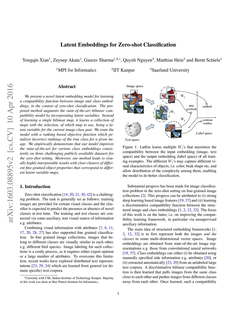 We present a novel latent embedding model for learning a compatibility function between image and class embeddings, in the context of zero-shot classification. The proposed method augments the state-of-the-art bilinear compatibility model by incorporating latent variables. Instead of learning a single bilinear map, it learns a collection of maps with the selection, of which map to use, being a latent variable for the current image-class pair. We train the model with a ranking based objective function which penalizes incorrect rankings of the true class for a given image. We empirically demonstrate that our model improves the state-of-the-art for various class embeddings consistently on three challenging publicly available datasets for the zero-shot setting. Moreover, our method leads to visually highly interpretable results with clear clusters of different fine-grained object properties that correspond to different latent variable maps.