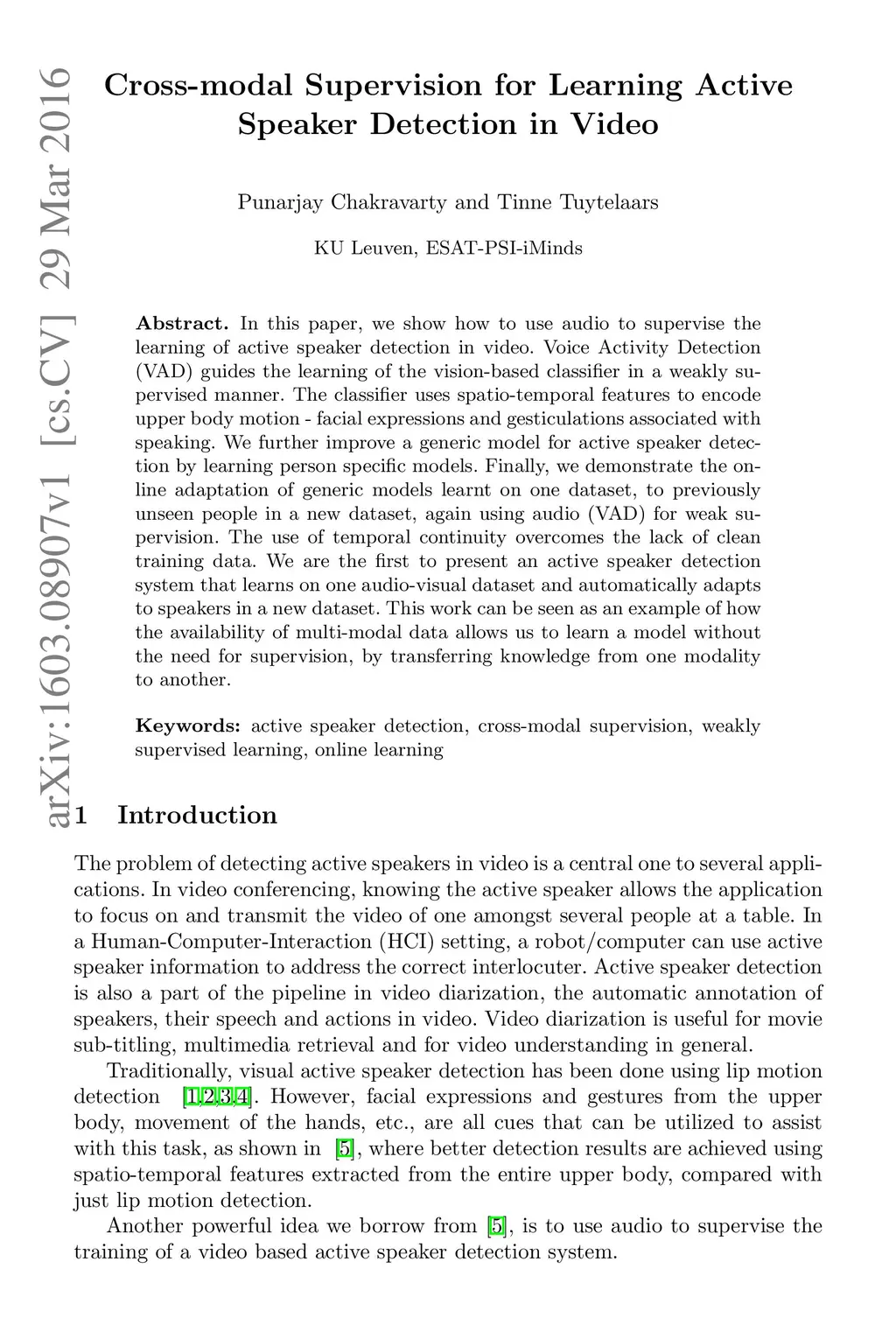 In this paper, we show how to use audio to supervise the learning of active speaker detection in video. Voice Activity Detection (VAD) guides the learning of the vision-based classifier in a weakly supervised manner. The classifier uses spatio-temporal features to encode upper body motion - facial expressions and gesticulations associated with speaking. We further improve a generic model for active speaker detection by learning person specific models. Finally, we demonstrate the online adaptation of generic models learnt on one dataset, to previously unseen people in a new dataset, again using audio (VAD) for weak supervision. The use of temporal continuity overcomes the lack of clean training data. We are the first to present an active speaker detection system that learns on one audio-visual dataset and automatically adapts to speakers in a new dataset. This work can be seen as an example of how the availability of multi-modal data allows us to learn a model without the need for supervision, by transferring knowledge from one modality to another.