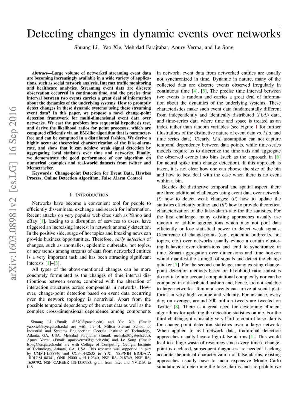 Large volume of networked streaming event data are becoming increasingly available in a wide variety of applications, such as social network analysis, Internet traffic monitoring and healthcare analytics. Streaming event data are discrete observation occurred in continuous time, and the precise time interval between two events carries a great deal of information about the dynamics of the underlying systems. How to promptly detect changes in these dynamic systems using these streaming event data? In this paper, we propose a novel change-point detection framework for multi-dimensional event data over networks. We cast the problem into sequential hypothesis test, and derive the likelihood ratios for point processes, which are computed efficiently via an EM-like algorithm that is parameter-free and can be computed in a distributed fashion. We derive a highly accurate theoretical characterization of the false-alarm-rate, and show that it can achieve weak signal detection by aggregating local statistics over time and networks. Finally, we demonstrate the good performance of our algorithm on numerical examples and real-world datasets from twitter and Memetracker.