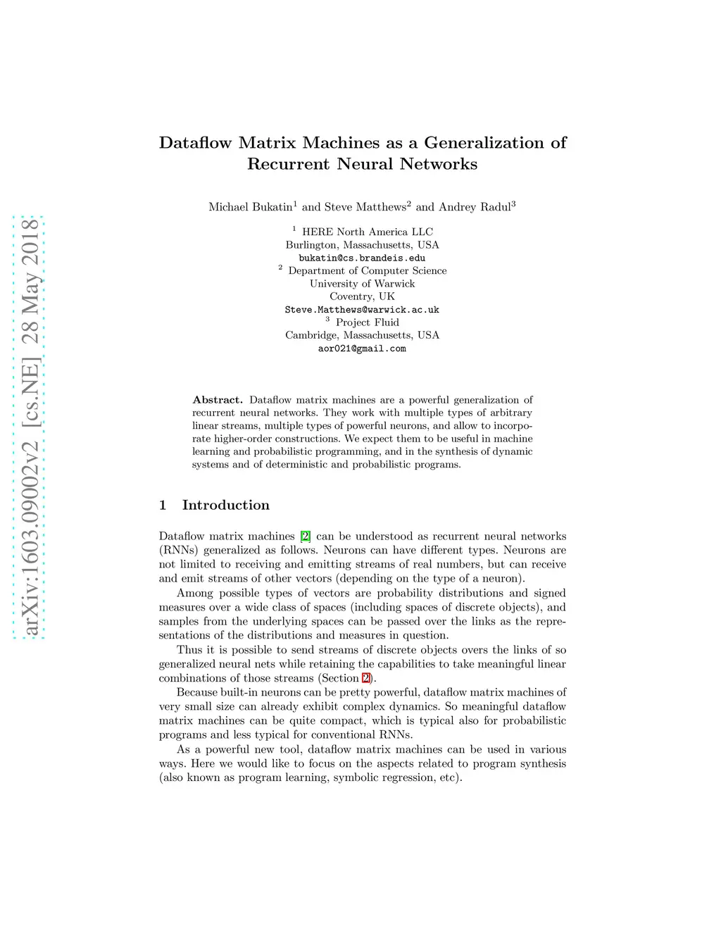 Dataflow matrix machines are a powerful generalization of recurrent neural networks. They work with multiple types of arbitrary linear streams, multiple types of powerful neurons, and allow to incorporate higher-order constructions. We expect them to be useful in machine learning and probabilistic programming, and in the synthesis of dynamic systems and of deterministic and probabilistic programs.