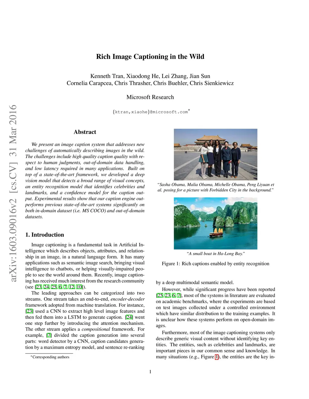 We present an image caption system that addresses new challenges of automatically describing images in the wild. The challenges include high quality caption quality with respect to human judgments, out-of-domain data handling, and low latency required in many applications. Built on top of a state-of-the-art framework, we developed a deep vision model that detects a broad range of visual concepts, an entity recognition model that identifies celebrities and landmarks, and a confidence model for the caption output. Experimental results show that our caption engine outperforms previous state-of-the-art systems significantly on both in-domain dataset (i.e. MS COCO) and out of-domain datasets.