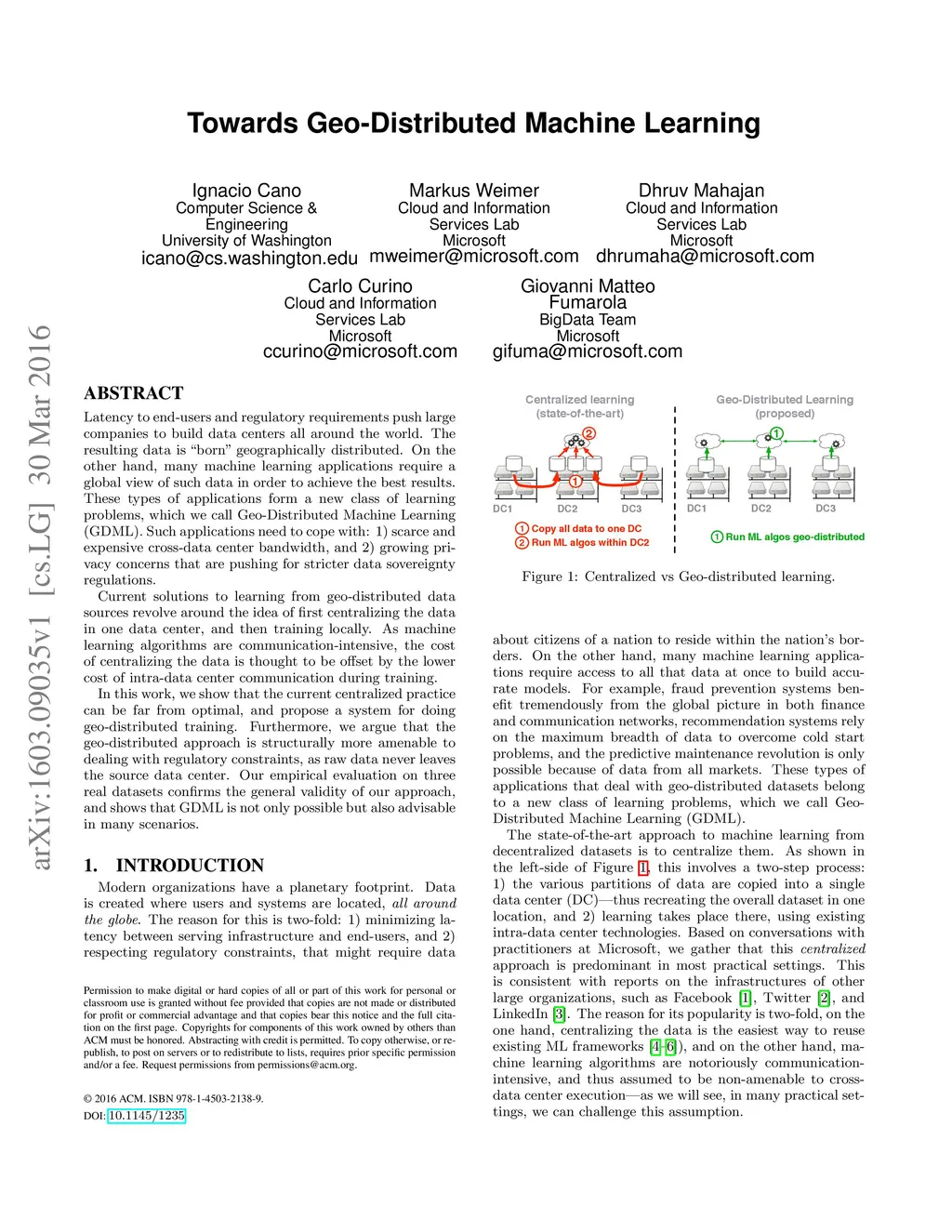 Latency to end-users and regulatory requirements push large companies to build data centers all around the world. The resulting data is "born" geographically distributed. On the other hand, many machine learning applications require a global view of such data in order to achieve the best results. These types of applications form a new class of learning problems, which we call Geo-Distributed Machine Learning (GDML). Such applications need to cope with: 1) scarce and expensive cross-data center bandwidth, and 2) growing privacy concerns that are pushing for stricter data sovereignty regulations. Current solutions to learning from geo-distributed data sources revolve around the idea of first centralizing the data in one data center, and then training locally. As machine learning algorithms are communication-intensive, the cost of centralizing the data is thought to be offset by the lower cost of intra-data center communication during training. In this work, we show that the current centralized practice can be far from optimal, and propose a system for doing geo-distributed training. Furthermore, we argue that the geo-distributed approach is structurally more amenable to dealing with regulatory constraints, as raw data never leaves the source data center. Our empirical evaluation on three real datasets confirms the general validity of our approach, and shows that GDML is not only possible but also advisable in many scenarios.