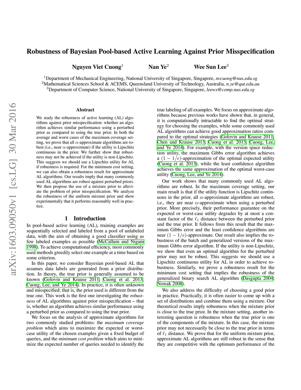 We study the robustness of active learning (AL) algorithms against prior misspecification: whether an algorithm achieves similar performance using a perturbed prior as compared to using the true prior. In both the average and worst cases of the maximum coverage setting, we prove that all -approximate algorithms are robust (i.e., near -approximate) if the utility is Lipschitz continuous in the prior. We further show that robustness may not be achieved if the utility is non-Lipschitz. This suggests we should use a Lipschitz utility for AL if robustness is required. For the minimum cost setting, we can also obtain a robustness result for approximate AL algorithms. Our results imply that many commonly used AL algorithms are robust against perturbed priors. We then propose the use of a mixture prior to alleviate the problem of prior misspecification. We analyze the robustness of the uniform mixture prior and show experimentally that it performs reasonably well in practice.