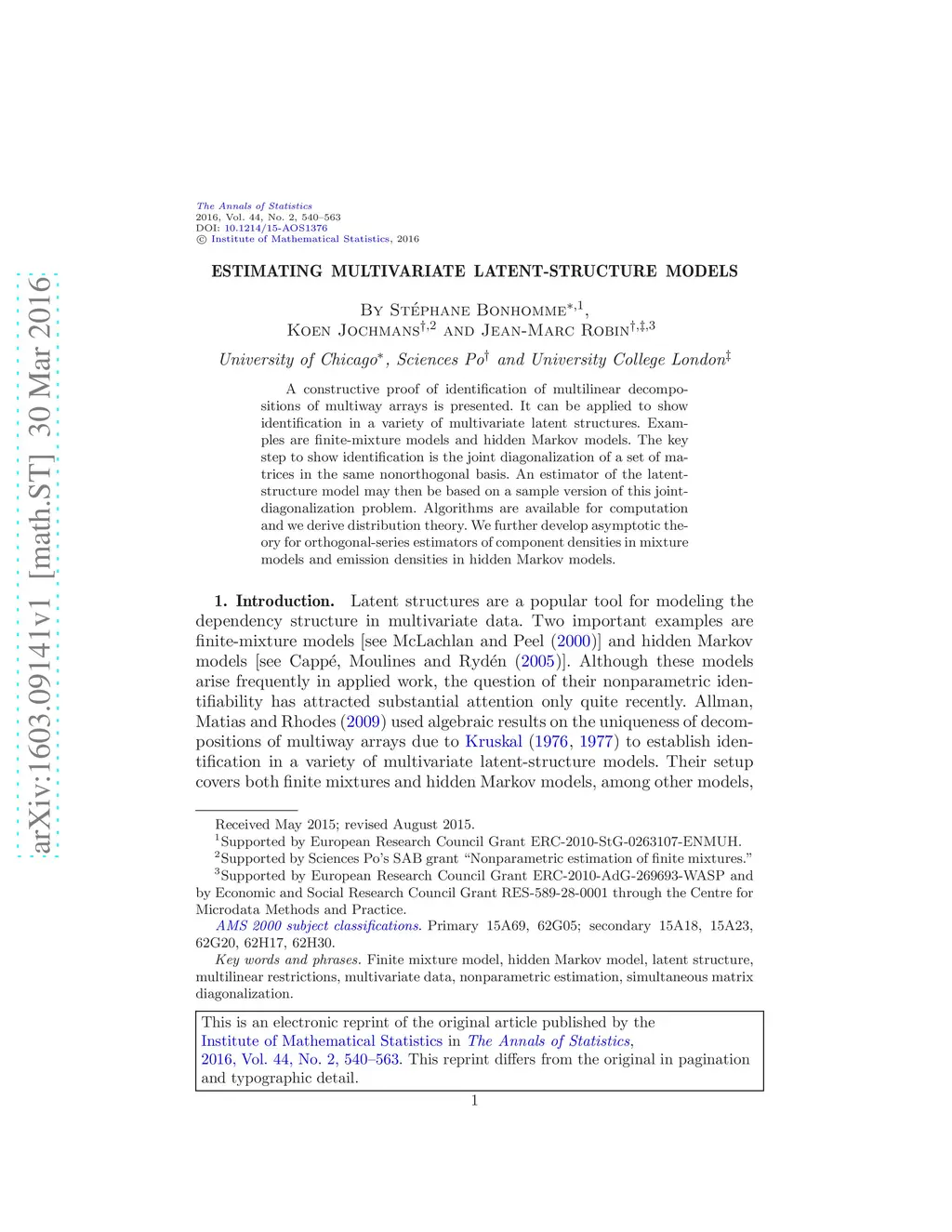 A constructive proof of identification of multilinear decompositions of multiway arrays is presented. It can be applied to show identification in a variety of multivariate latent structures. Examples are finite-mixture models and hidden Markov models. The key step to show identification is the joint diagonalization of a set of matrices in the same nonorthogonal basis. An estimator of the latent-structure model may then be based on a sample version of this joint-diagonalization problem. Algorithms are available for computation and we derive distribution theory. We further develop asymptotic theory for orthogonal-series estimators of component densities in mixture models and emission densities in hidden Markov models.