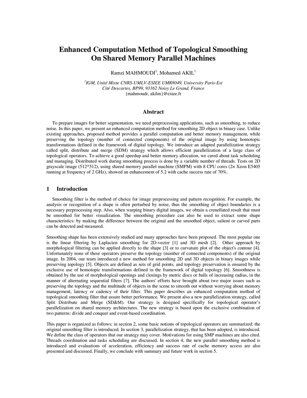 To prepare images for better segmentation, we need preprocessing applications, such as smoothing, to reduce noise. In this paper, we present an enhanced computation method for smoothing 2D object in binary case. Unlike existing approaches, proposed method provides a parallel computation and better memory management, while preserving the topology (number of connected components) of the original image by using homotopic transformations defined in the framework of digital topology. We introduce an adapted parallelization strategy called split, distribute and merge (SDM) strategy which allows efficient parallelization of a large class of topological operators. To achieve a good speedup and better memory allocation, we cared about task scheduling and managing. Distributed work during smoothing process is done by a variable number of threads. Tests on 2D grayscale image (512*512), using shared memory parallel machine (SMPM) with 8 CPU cores (2 Xeon E5405 running at frequency of 2 GHz), showed an enhancement of 5.2 with cache success rate of 70%.