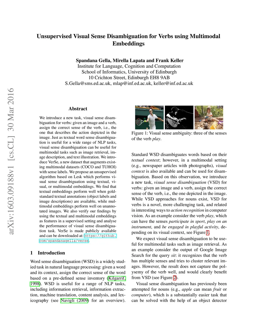 We introduce a new task, visual sense disambiguation for verbs: given an image and a verb, assign the correct sense of the verb, i.e., the one that describes the action depicted in the image. Just as textual word sense disambiguation is useful for a wide range of NLP tasks, visual sense disambiguation can be useful for multimodal tasks such as image retrieval, image description, and text illustration. We introduce VerSe, a new dataset that augments existing multimodal datasets (COCO and TUHOI) with sense labels. We propose an unsupervised algorithm based on Lesk which performs visual sense disambiguation using textual, visual, or multimodal embeddings. We find that textual embeddings perform well when gold-standard textual annotations (object labels and image descriptions) are available, while multimodal embeddings perform well on unannotated images. We also verify our findings by using the textual and multimodal embeddings as features in a supervised setting and analyse the performance of visual sense disambiguation task. VerSe is made publicly available and can be downloaded at: https://github.com/spandanagella/verse.