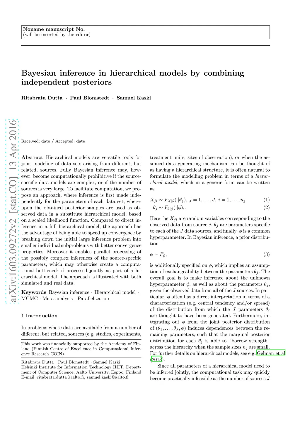 Bayesian inference in hierarchical models by combining independent