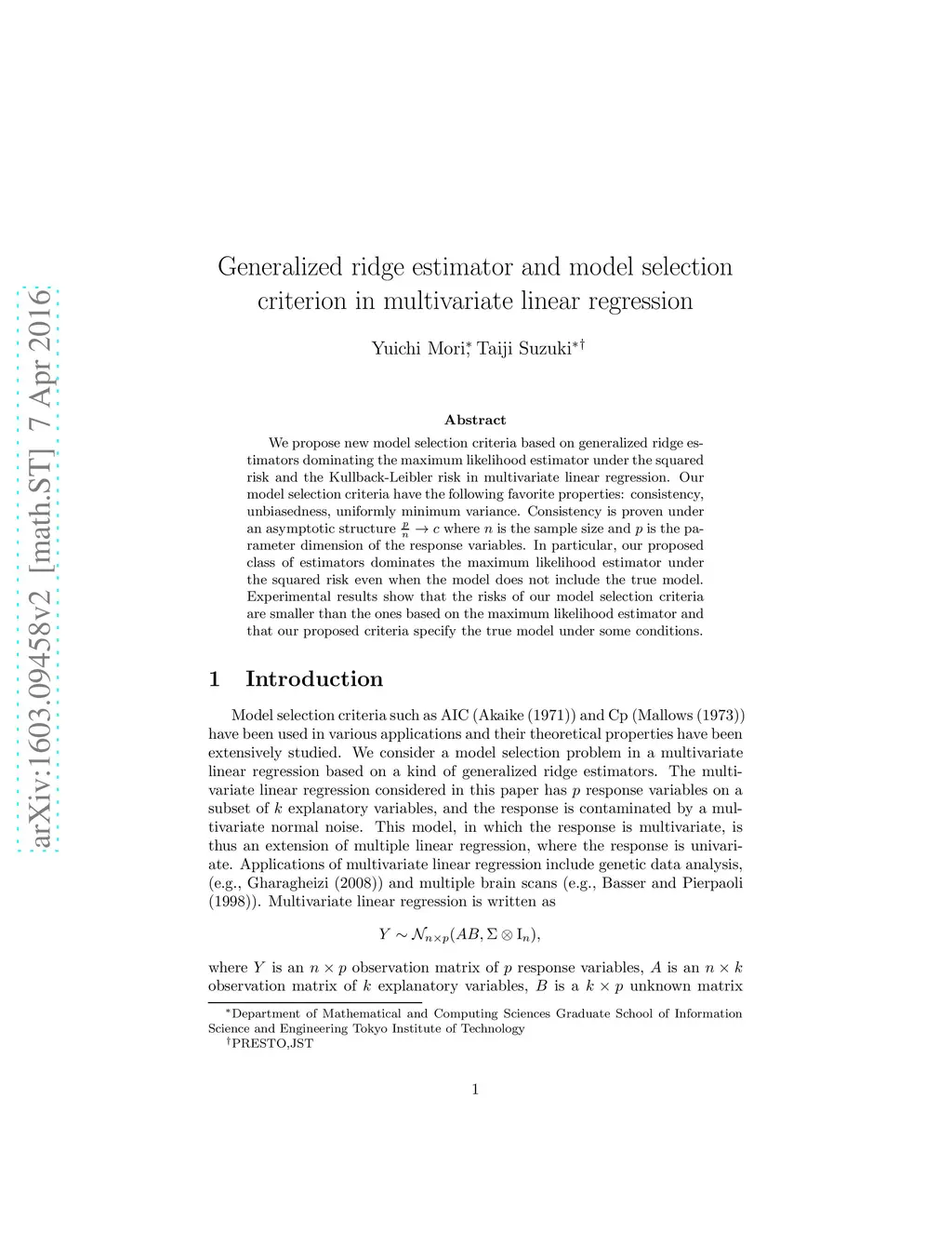 We propose new model selection criteria based on generalized ridge estimators dominating the maximum likelihood estimator under the squared risk and the Kullback-Leibler risk in multivariate linear regression. Our model selection criteria have the following favorite properties: consistency, unbiasedness, uniformly minimum variance. Consistency is proven under an asymptotic structure where is the sample size and is the parameter dimension of the response variables. In particular, our proposed class of estimators dominates the maximum likelihood estimator under the squared risk even when the model does not include the true model. Experimental results show that the risks of our model selection criteria are smaller than the ones based on the maximum likelihood estimator and that our proposed criteria specify the true model under some conditions.