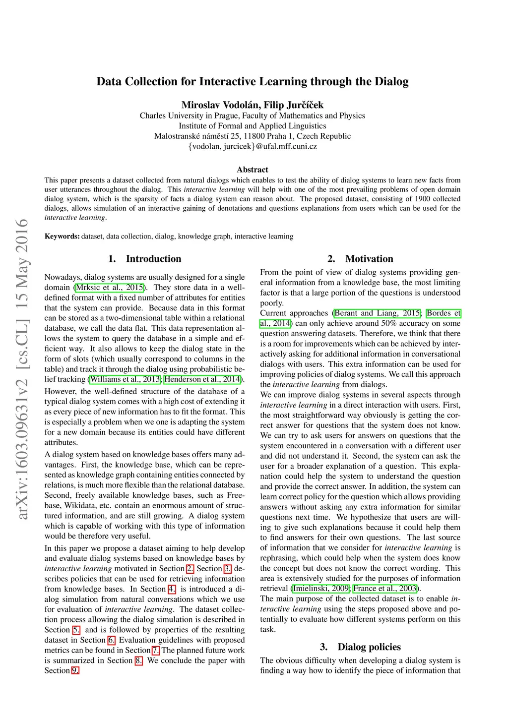 This paper presents a dataset collected from natural dialogs which enables to test the ability of dialog systems to learn new facts from user utterances throughout the dialog. This interactive learning will help with one of the most prevailing problems of open domain dialog system, which is the sparsity of facts a dialog system can reason about. The proposed dataset, consisting of 1900 collected dialogs, allows simulation of an interactive gaining of denotations and questions explanations from users which can be used for the interactive learning.
