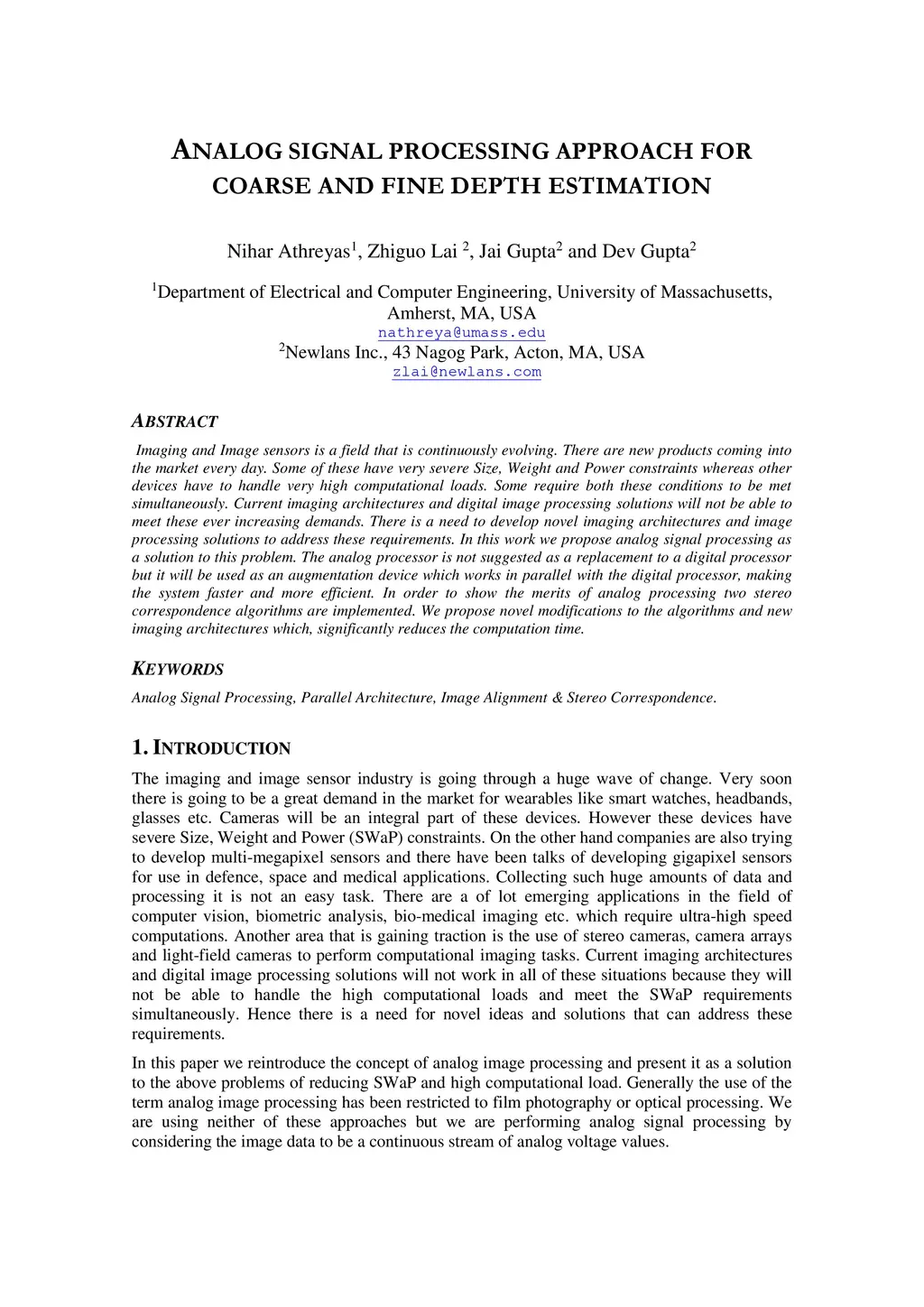 Imaging and Image sensors is a field that is continuously evolving. There are new products coming into the market every day. Some of these have very severe Size, Weight and Power constraints whereas other devices have to handle very high computational loads. Some require both these conditions to be met simultaneously. Current imaging architectures and digital image processing solutions will not be able to meet these ever increasing demands. There is a need to develop novel imaging architectures and image processing solutions to address these requirements. In this work we propose analog signal processing as a solution to this problem. The analog processor is not suggested as a replacement to a digital processor but it will be used as an augmentation device which works in parallel with the digital processor, making the system faster and more efficient. In order to show the merits of analog processing two stereo correspondence algorithms are implemented. We propose novel modifications to the algorithms and new imaging architectures which, significantly reduces the computation time.