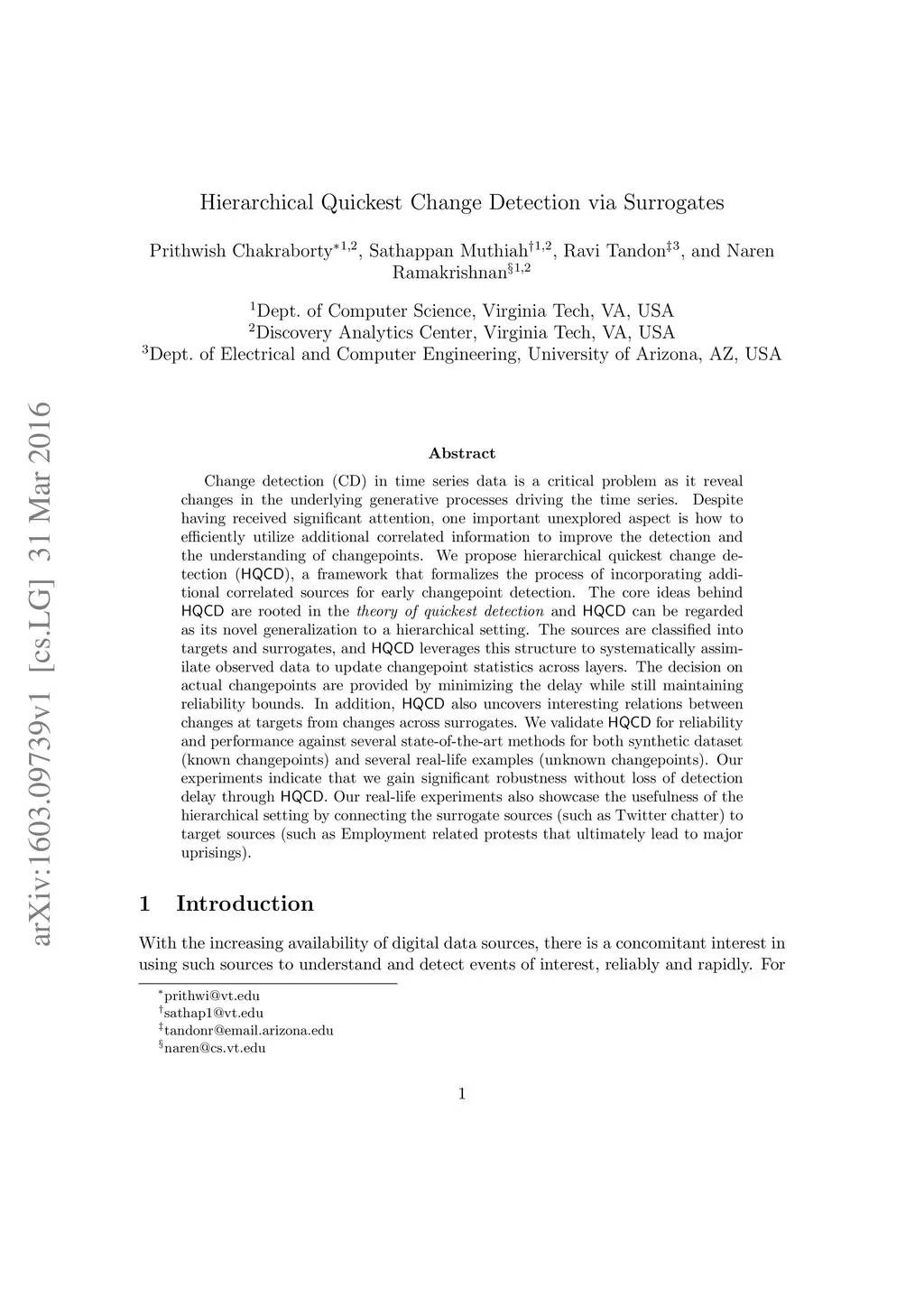 Change detection (CD) in time series data is a critical problem as it reveal changes in the underlying generative processes driving the time series. Despite having received significant attention, one important unexplored aspect is how to efficiently utilize additional correlated information to improve the detection and the understanding of changepoints. We propose hierarchical quickest change detection (HQCD), a framework that formalizes the process of incorporating additional correlated sources for early changepoint detection. The core ideas behind HQCD are rooted in the theory of quickest detection and HQCD can be regarded as its novel generalization to a hierarchical setting. The sources are classified into targets and surrogates, and HQCD leverages this structure to systematically assimilate observed data to update changepoint statistics across layers. The decision on actual changepoints are provided by minimizing the delay while still maintaining reliability bounds. In addition, HQCD also uncovers interesting relations between changes at targets from changes across surrogates. We validate HQCD for reliability and performance against several state-of-the-art methods for both synthetic dataset (known changepoints) and several real-life examples (unknown changepoints). Our experiments indicate that we gain significant robustness without loss of detection delay through HQCD. Our real-life experiments also showcase the usefulness of the hierarchical setting by connecting the surrogate sources (such as Twitter chatter) to target sources (such as Employment related protests that ultimately lead to major uprisings).