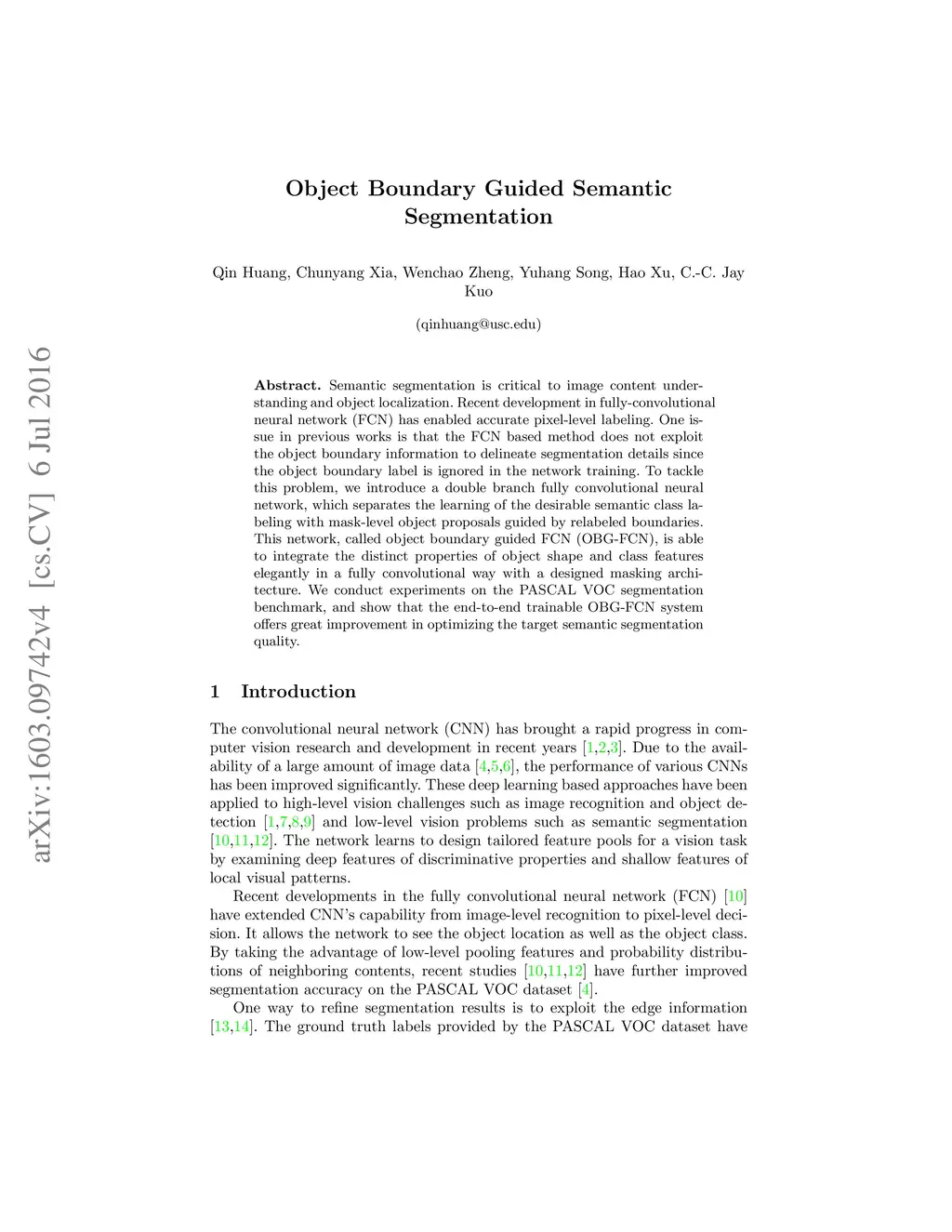 Semantic segmentation is critical to image content understanding and object localization. Recent development in fully-convolutional neural network (FCN) has enabled accurate pixel-level labeling. One issue in previous works is that the FCN based method does not exploit the object boundary information to delineate segmentation details since the object boundary label is ignored in the network training. To tackle this problem, we introduce a double branch fully convolutional neural network, which separates the learning of the desirable semantic class labeling with mask-level object proposals guided by relabeled boundaries. This network, called object boundary guided FCN (OBG-FCN), is able to integrate the distinct properties of object shape and class features elegantly in a fully convolutional way with a designed masking architecture. We conduct experiments on the PASCAL VOC segmentation benchmark, and show that the end-to-end trainable OBG-FCN system offers great improvement in optimizing the target semantic segmentation quality.