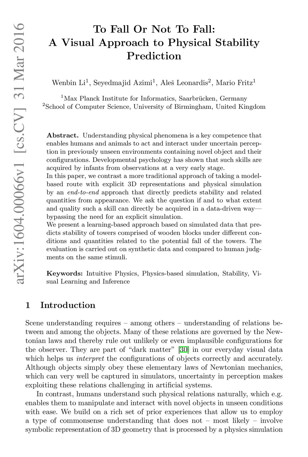 Understanding physical phenomena is a key competence that enables humans and animals to act and interact under uncertain perception in previously unseen environments containing novel object and their configurations. Developmental psychology has shown that such skills are acquired by infants from observations at a very early stage. In this paper, we contrast a more traditional approach of taking a model-based route with explicit 3D representations and physical simulation by an end-to-end approach that directly predicts stability and related quantities from appearance. We ask the question if and to what extent and quality such a skill can directly be acquired in a data-driven way bypassing the need for an explicit simulation. We present a learning-based approach based on simulated data that predicts stability of towers comprised of wooden blocks under different conditions and quantities related to the potential fall of the towers. The evaluation is carried out on synthetic data and compared to human judgments on the same stimuli.