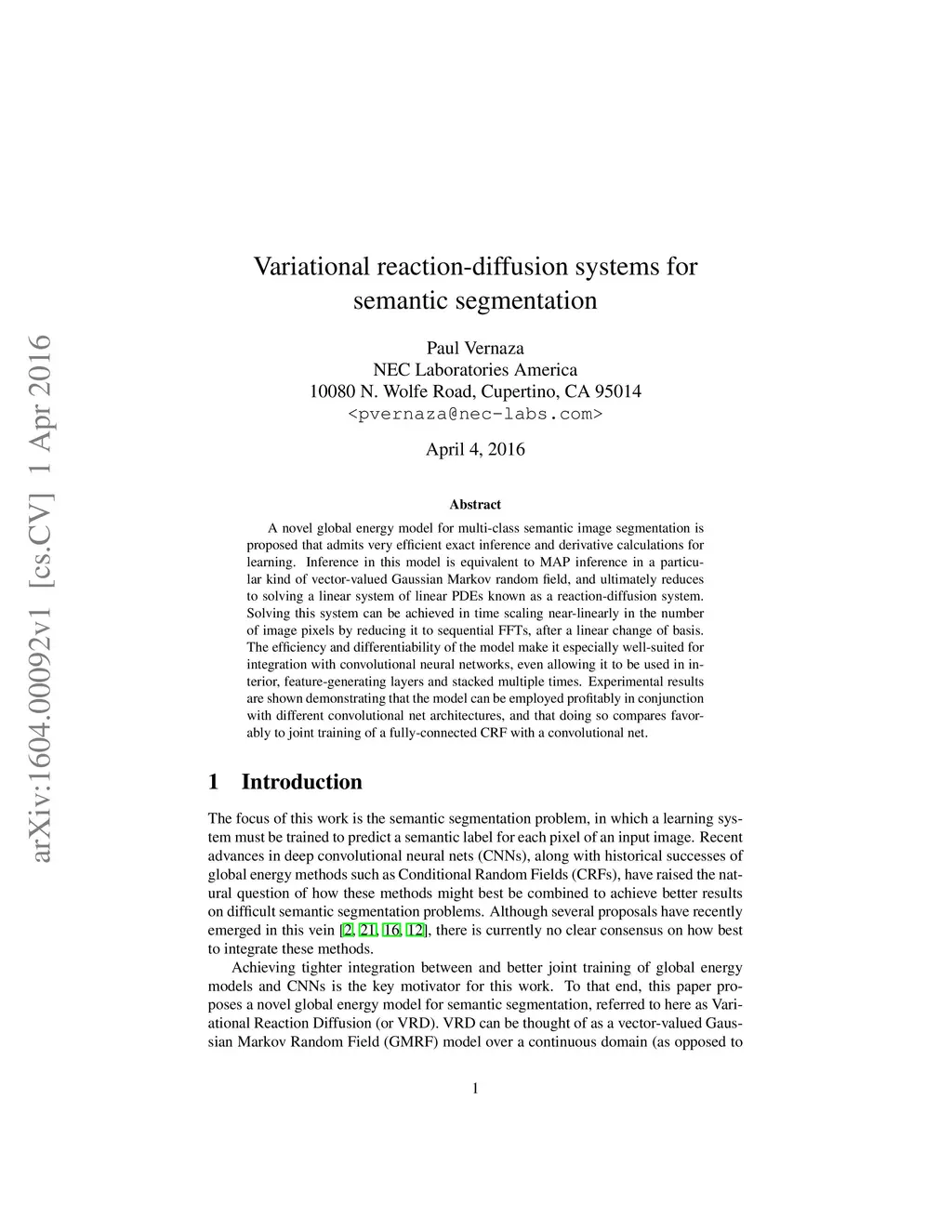 A novel global energy model for multi-class semantic image segmentation is proposed that admits very efficient exact inference and derivative calculations for learning. Inference in this model is equivalent to MAP inference in a particular kind of vector-valued Gaussian Markov random field, and ultimately reduces to solving a linear system of linear PDEs known as a reaction-diffusion system. Solving this system can be achieved in time scaling near-linearly in the number of image pixels by reducing it to sequential FFTs, after a linear change of basis. The efficiency and differentiability of the model make it especially well-suited for integration with convolutional neural networks, even allowing it to be used in interior, feature-generating layers and stacked multiple times. Experimental results are shown demonstrating that the model can be employed profitably in conjunction with different convolutional net architectures, and that doing so compares favorably to joint training of a fully-connected CRF with a convolutional net.