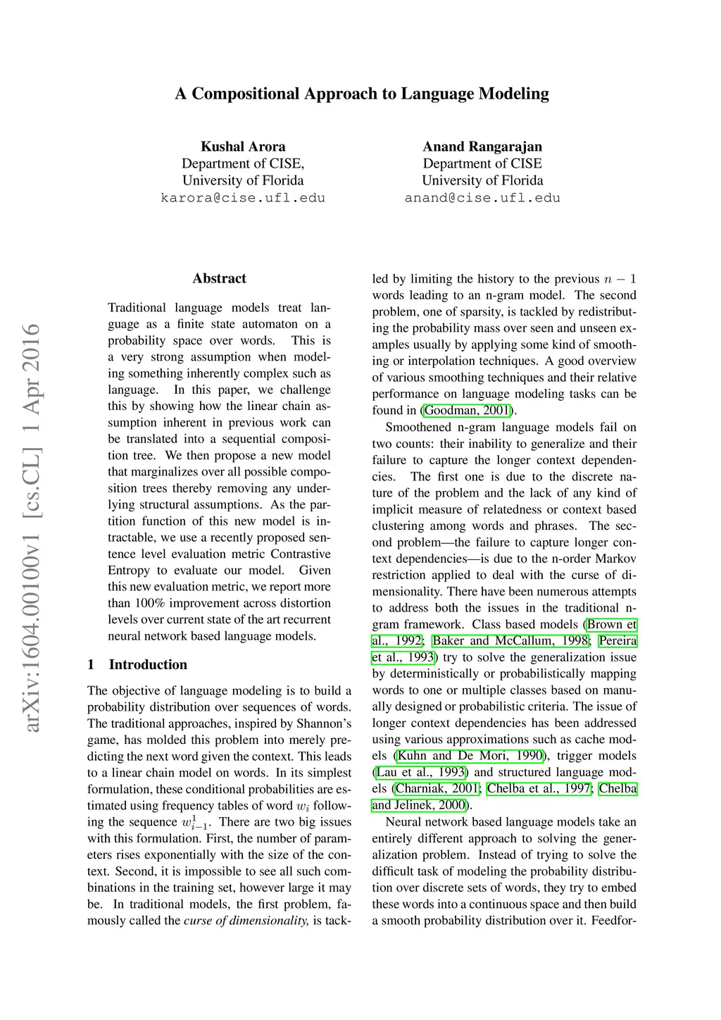 Traditional language models treat language as a finite state automaton on a probability space over words. This is a very strong assumption when modeling something inherently complex such as language. In this paper, we challenge this by showing how the linear chain assumption inherent in previous work can be translated into a sequential composition tree. We then propose a new model that marginalizes over all possible composition trees thereby removing any underlying structural assumptions. As the partition function of this new model is intractable, we use a recently proposed sentence level evaluation metric Contrastive Entropy to evaluate our model. Given this new evaluation metric, we report more than 100% improvement across distortion levels over current state of the art recurrent neural network based language models.
