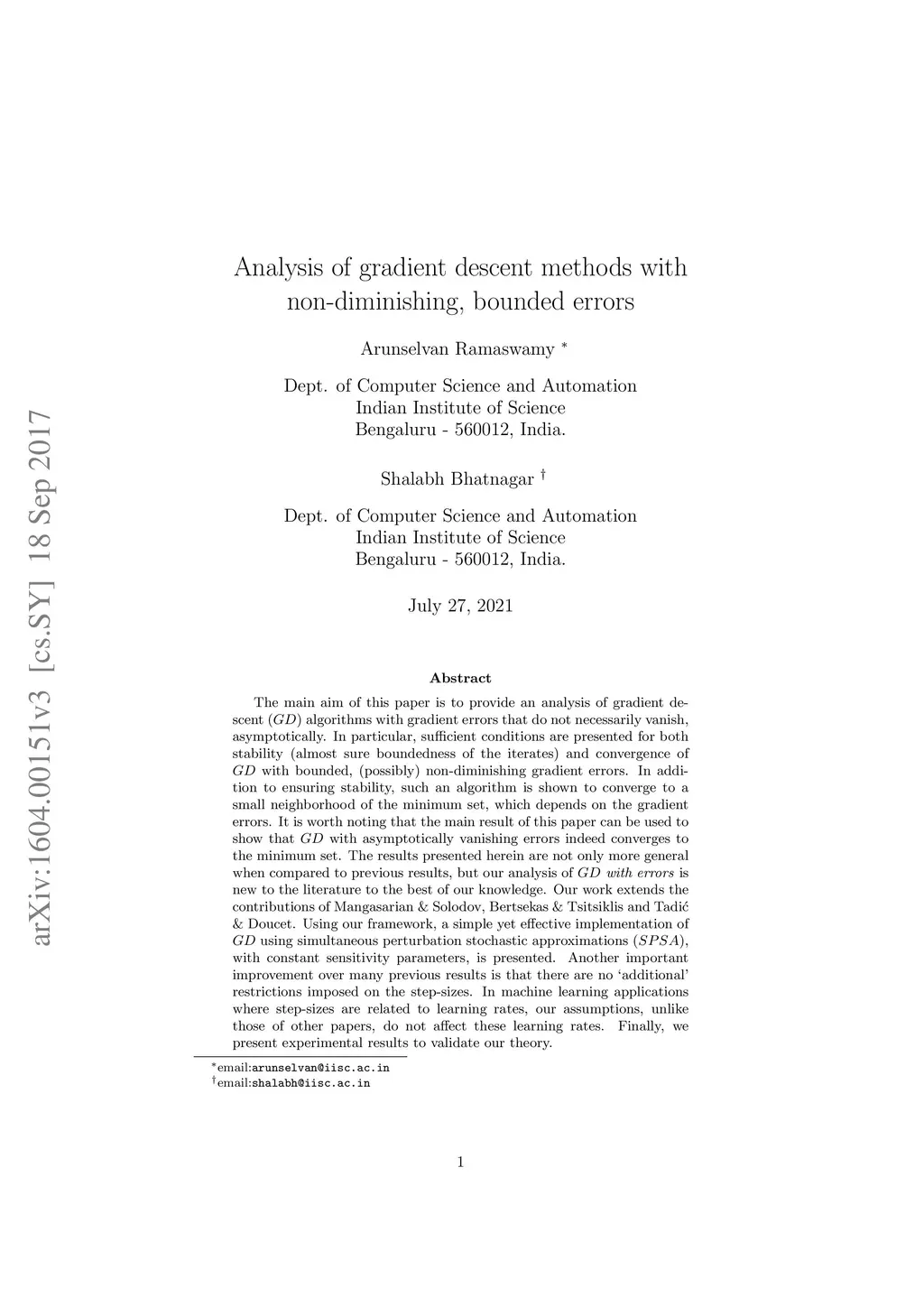 The main aim of this paper is to provide an analysis of gradient descent (GD) algorithms with gradient errors that do not necessarily vanish, asymptotically. In particular, sufficient conditions are presented for both stability (almost sure boundedness of the iterates) and convergence of GD with bounded, (possibly) non-diminishing gradient errors. In addition to ensuring stability, such an algorithm is shown to converge to a small neighborhood of the minimum set, which depends on the gradient errors. It is worth noting that the main result of this paper can be used to show that GD with asymptotically vanishing errors indeed converges to the minimum set. The results presented herein are not only more general when compared to previous results, but our analysis of GD with errors is new to the literature to the best of our knowledge. Our work extends the contributions of Mangasarian & Solodov, Bertsekas & Tsitsiklis and Tadic & Doucet. Using our framework, a simple yet effective implementation of GD using simultaneous perturbation stochastic approximations (SP SA), with constant sensitivity parameters, is presented. Another important improvement over many previous results is that there are no `additional' restrictions imposed on the step-sizes. In machine learning applications where step-sizes are related to learning rates, our assumptions, unlike those of other papers, do not affect these learning rates. Finally, we present experimental results to validate our theory.