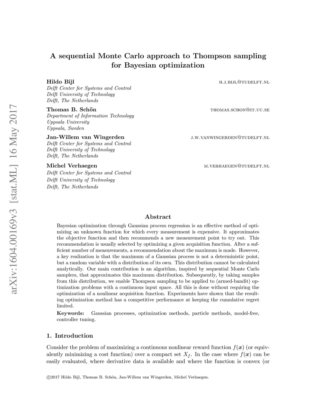 Bayesian optimization through Gaussian process regression is an effective method of optimizing an unknown function for which every measurement is expensive. It approximates the objective function and then recommends a new measurement point to try out. This recommendation is usually selected by optimizing a given acquisition function. After a sufficient number of measurements, a recommendation about the maximum is made. However, a key realization is that the maximum of a Gaussian process is not a deterministic point, but a random variable with a distribution of its own. This distribution cannot be calculated analytically. Our main contribution is an algorithm, inspired by sequential Monte Carlo samplers, that approximates this maximum distribution. Subsequently, by taking samples from this distribution, we enable Thompson sampling to be applied to (armed-bandit) optimization problems with a continuous input space. All this is done without requiring the optimization of a nonlinear acquisition function. Experiments have shown that the resulting optimization method has a competitive performance at keeping the cumulative regret limited.