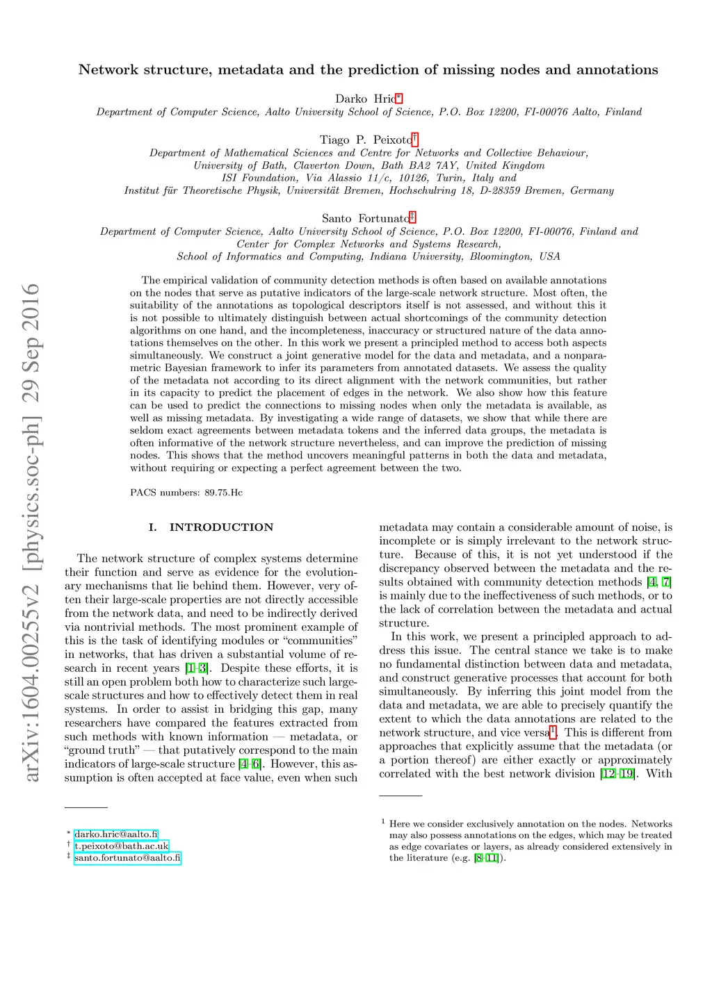 Network structure, metadata and the prediction of missing nodes