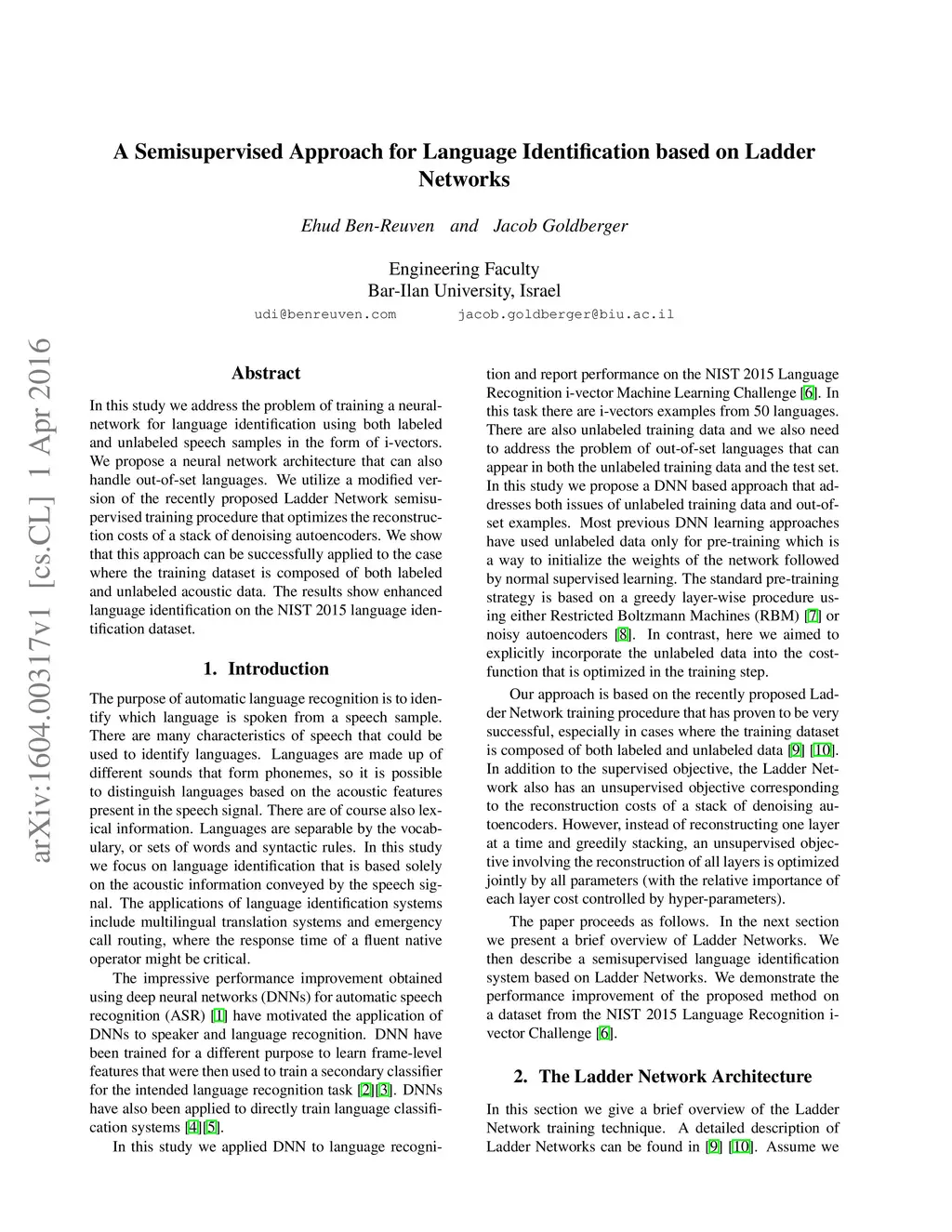 In this study we address the problem of training a neuralnetwork for language identification using both labeled and unlabeled speech samples in the form of i-vectors. We propose a neural network architecture that can also handle out-of-set languages. We utilize a modified version of the recently proposed Ladder Network semisupervised training procedure that optimizes the reconstruction costs of a stack of denoising autoencoders. We show that this approach can be successfully applied to the case where the training dataset is composed of both labeled and unlabeled acoustic data. The results show enhanced language identification on the NIST 2015 language identification dataset.