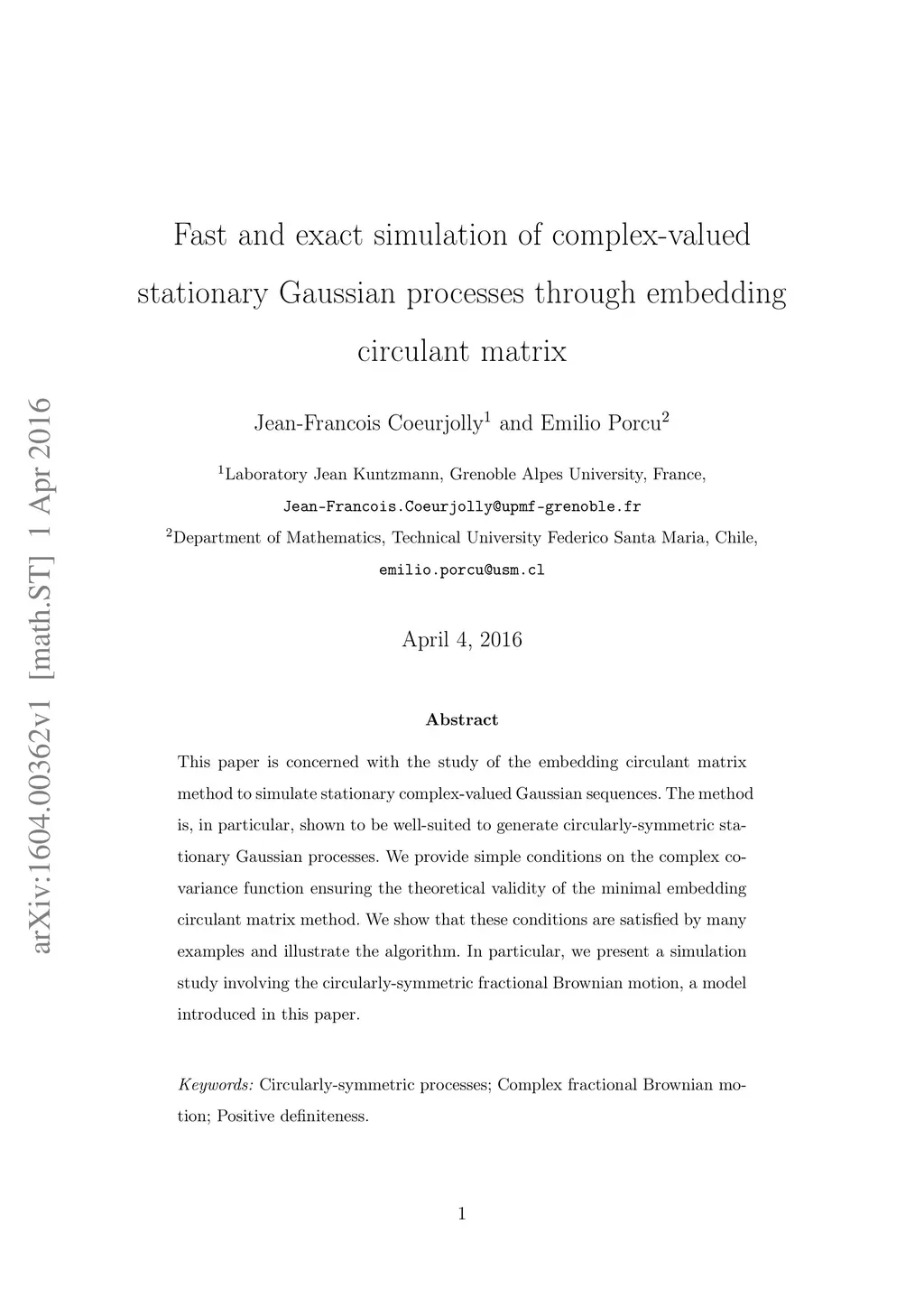 This paper is concerned with the study of the embedding circulant matrix method to simulate stationary complex-valued Gaussian sequences. The method is, in particular, shown to be well-suited to generate circularly-symmetric stationary Gaussian processes. We provide simple conditions on the complex co-variance function ensuring the theoretical validity of the minimal embedding circulant matrix method. We show that these conditions are satisfied by many examples and illustrate the algorithm. In particular, we present a simulation study involving the circularly-symmetric fractional Brownian motion, a model introduced in this paper.