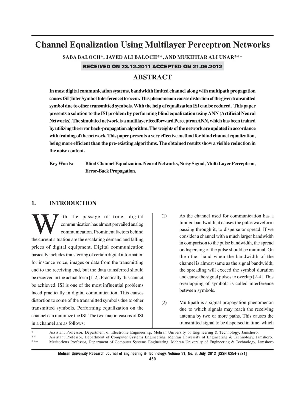 Channel Equalization Using Multilayer Perceptron Networks