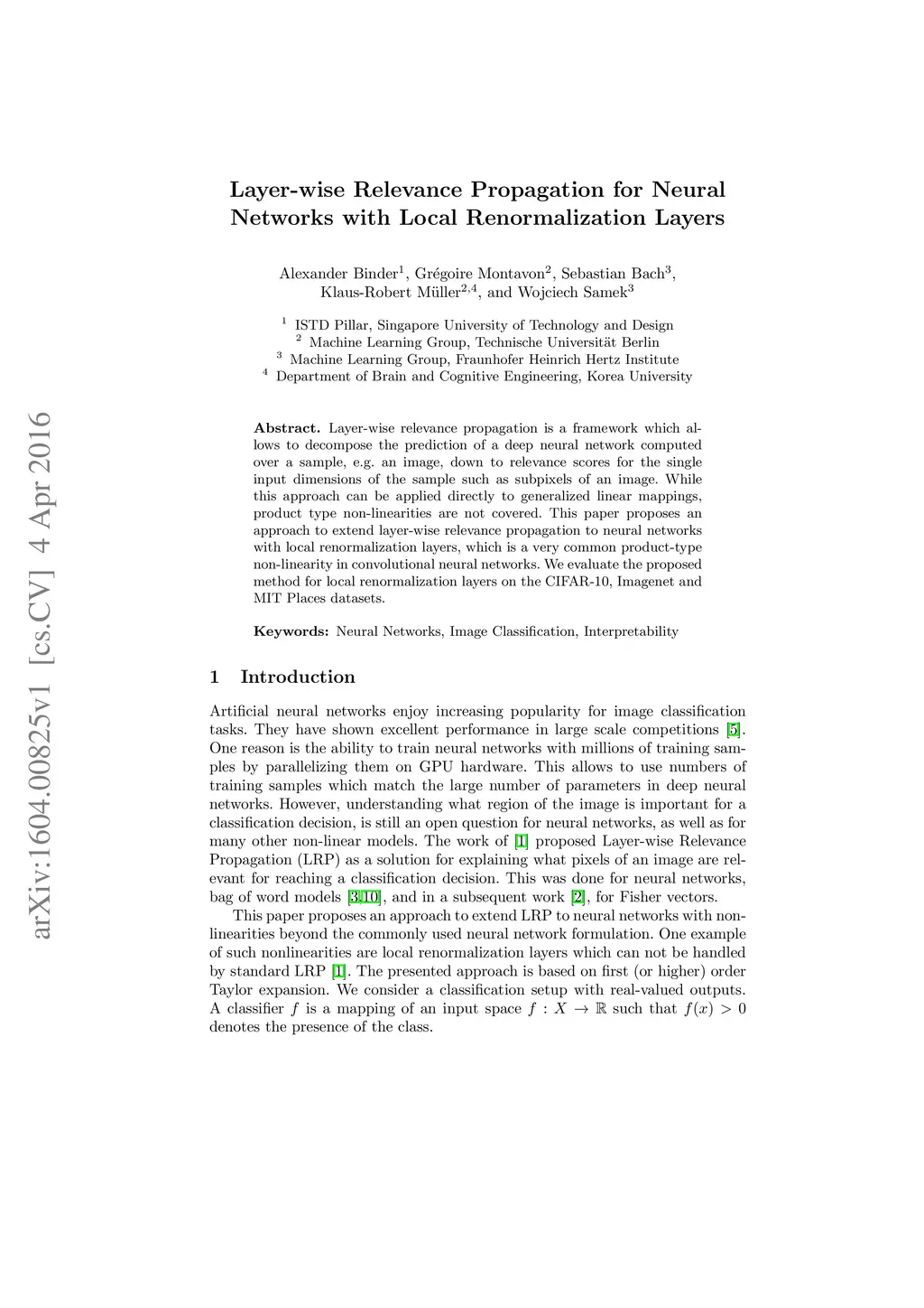 Layer-wise Relevance Propagation for Neural Networks with Local