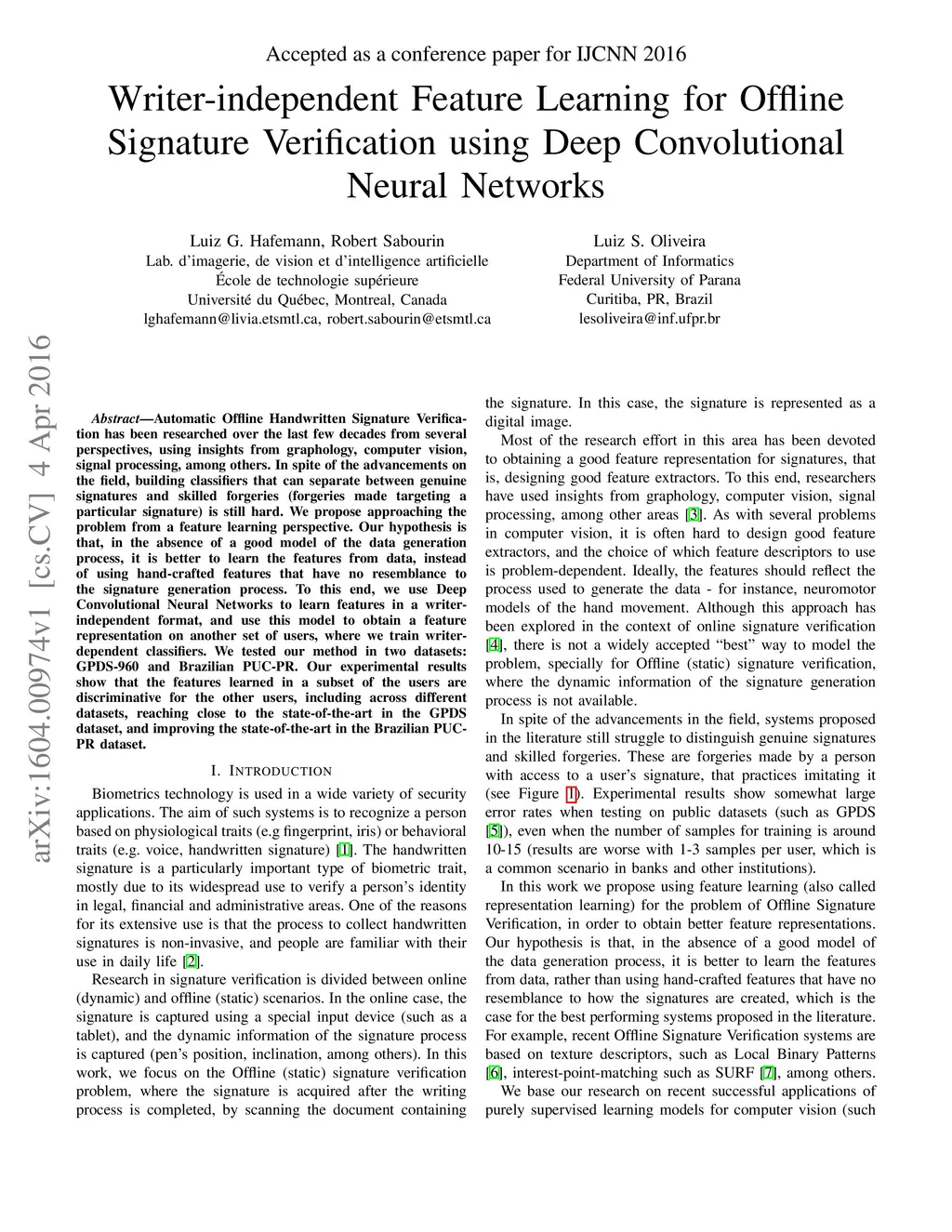Automatic Offline Handwritten Signature Verification has been researched over the last few decades from several perspectives, using insights from graphology, computer vision, signal processing, among others. In spite of the advancements on the field, building classifiers that can separate between genuine signatures and skilled forgeries (forgeries made targeting a particular signature) is still hard. We propose approaching the problem from a feature learning perspective. Our hypothesis is that, in the absence of a good model of the data generation process, it is better to learn the features from data, instead of using hand-crafted features that have no resemblance to the signature generation process. To this end, we use Deep Convolutional Neural Networks to learn features in a writer-independent format, and use this model to obtain a feature representation on another set of users, where we train writer-dependent classifiers. We tested our method in two datasets: GPDS-960 and Brazilian PUC-PR. Our experimental results show that the features learned in a subset of the users are discriminative for the other users, including across different datasets, reaching close to the state-of-the-art in the GPDS dataset, and improving the state-of-the-art in the Brazilian PUC-PR dataset.