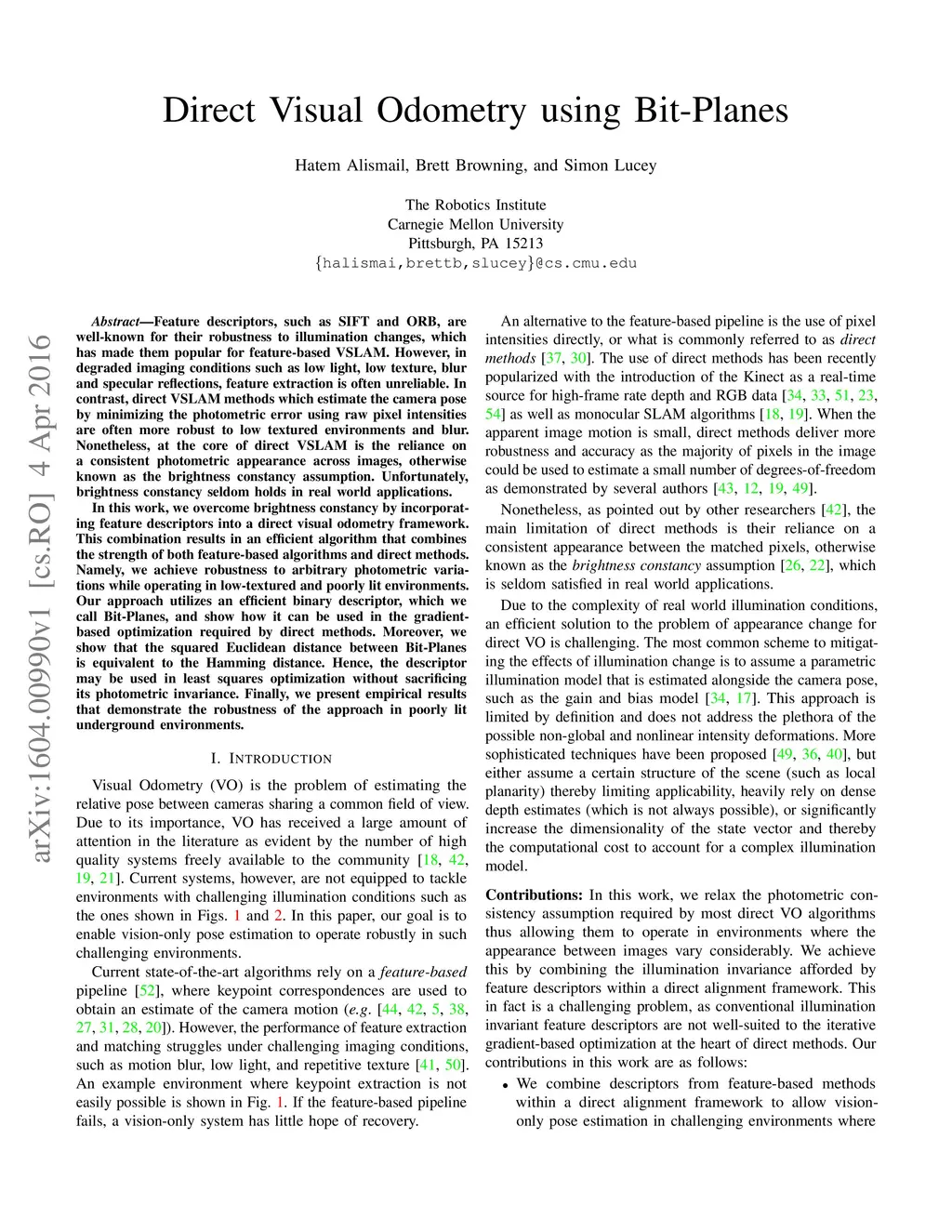 Feature descriptors, such as SIFT and ORB, are well-known for their robustness to illumination changes, which has made them popular for feature-based VSLAM\@. However, in degraded imaging conditions such as low light, low texture, blur and specular reflections, feature extraction is often unreliable. In contrast, direct VSLAM methods which estimate the camera pose by minimizing the photometric error using raw pixel intensities are often more robust to low textured environments and blur. Nonetheless, at the core of direct VSLAM is the reliance on a consistent photometric appearance across images, otherwise known as the brightness constancy assumption. Unfortunately, brightness constancy seldom holds in real world applications. In this work, we overcome brightness constancy by incorporating feature descriptors into a direct visual odometry framework. This combination results in an efficient algorithm that combines the strength of both feature-based algorithms and direct methods. Namely, we achieve robustness to arbitrary photometric variations while operating in low-textured and poorly lit environments. Our approach utilizes an efficient binary descriptor, which we call Bit-Planes, and show how it can be used in the gradient-based optimization required by direct methods. Moreover, we show that the squared Euclidean distance between Bit-Planes is equivalent to the Hamming distance. Hence, the descriptor may be used in least squares optimization without sacrificing its photometric invariance. Finally, we present empirical results that demonstrate the robustness of the approach in poorly lit underground environments.