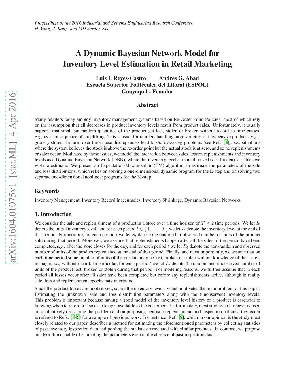 Many retailers today employ inventory management systems based on Re-Order Point Policies, most of which rely on the assumption that all decreases in product inventory levels result from product sales. Unfortunately, it usually happens that small but random quantities of the product get lost, stolen or broken without record as time passes, e.g., as a consequence of shoplifting. This is usual for retailers handling large varieties of inexpensive products, e.g., grocery stores. In turn, over time these discrepancies lead to stock freezing problems, i.e., situations where the system believes the stock is above the re-order point but the actual stock is at zero, and so no replenishments or sales occur. Motivated by these issues, we model the interaction between sales, losses, replenishments and inventory levels as a Dynamic Bayesian Network (DBN), where the inventory levels are unobserved (i.e., hidden) variables we wish to estimate. We present an Expectation-Maximization (EM) algorithm to estimate the parameters of the sale and loss distributions, which relies on solving a one-dimensional dynamic program for the E-step and on solving two separate one-dimensional nonlinear programs for the M-step.