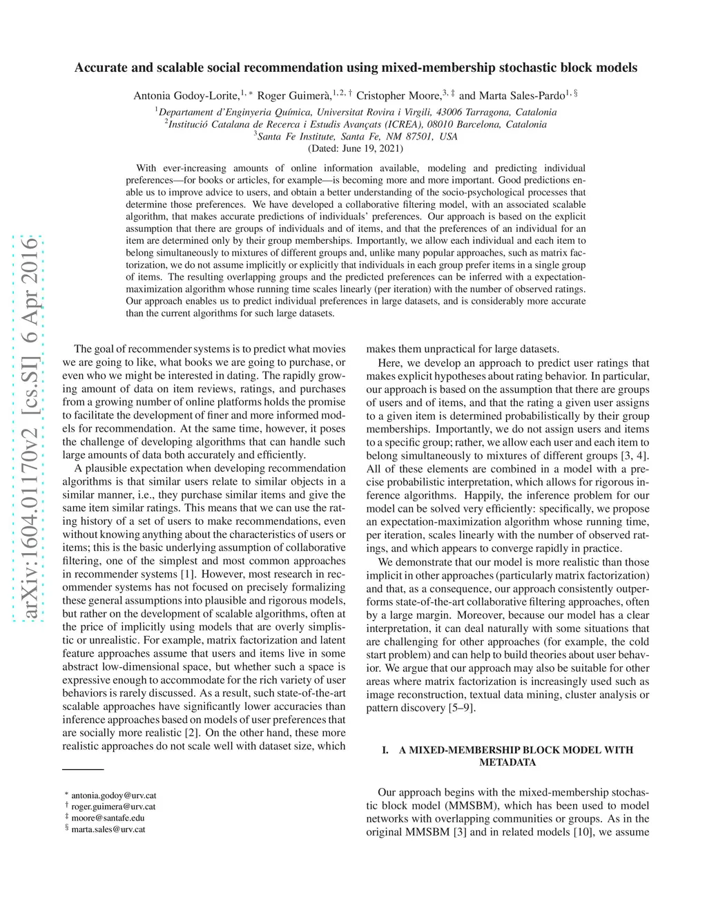 With ever-increasing amounts of online information available, modeling and predicting individual preferences-for books or articles, for example-is becoming more and more important. Good predictions enable us to improve advice to users, and obtain a better understanding of the socio-psychological processes that determine those preferences. We have developed a collaborative filtering model, with an associated scalable algorithm, that makes accurate predictions of individuals' preferences. Our approach is based on the explicit assumption that there are groups of individuals and of items, and that the preferences of an individual for an item are determined only by their group memberships. Importantly, we allow each individual and each item to belong simultaneously to mixtures of different groups and, unlike many popular approaches, such as matrix factorization, we do not assume implicitly or explicitly that individuals in each group prefer items in a single group of items. The resulting overlapping groups and the predicted preferences can be inferred with a expectation-maximization algorithm whose running time scales linearly (per iteration). Our approach enables us to predict individual preferences in large datasets, and is considerably more accurate than the current algorithms for such large datasets.